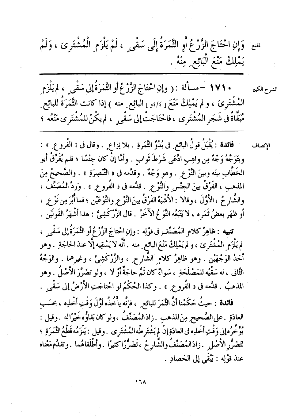 تنبيه: ظاهِرُ كلامِ المُصَنِّفِ في قوْلِه: وإنِ احْتاجَ الزَّرْعُ أو الثمَرَةُ إلى سَقْي، لم يَلْزَمِ المُشْتَرِيَ، ولم يَمْلِكْ مَنْعَ البائعِ منه. أنه لا يَسْقِيه إلَّا عندَ الحاجَةِ. وهو أحَدُ الوَجْهَين. وهو ظاهِرُ كلامِ الشارِحِ، والزَّرْكَشِيِّ، وغيرِهما. والوَجْهُ الثَّاني، له سَقْيُه للمَصْلَحَةِ، سَواء كان ثَم حاجَة أوْ لا، ولو تضَرَّرَ الأصْلُ. وهو المذهبُ. قامه في «الفُروعِ». وكذا الحُكْمُ لو احْتاجَتِ الأرْضُ إلى سَقْي.