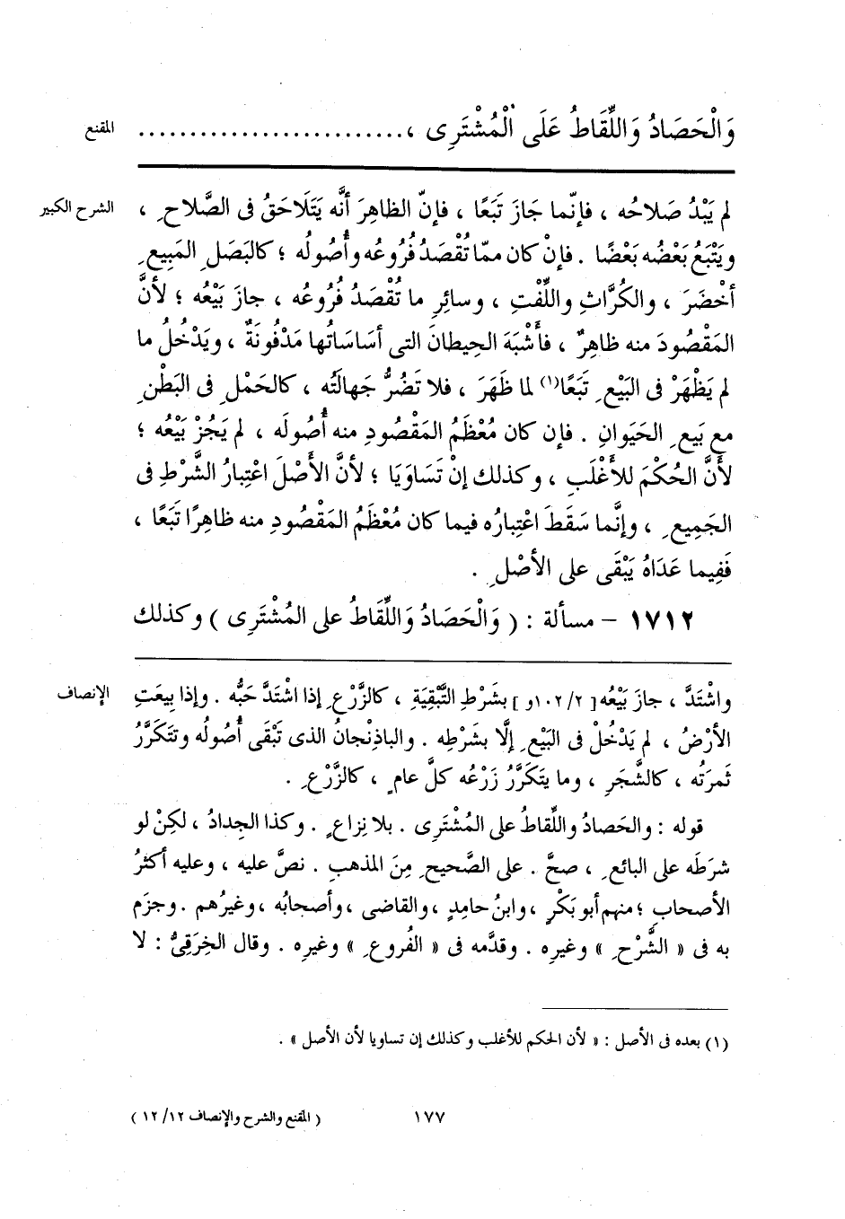 واشْتَدَّ، جازَ بَيعُه بشَرْطِ التبقِيَةِ، كالزَّرْعِ إذا اشتَدَّ حَبُّه. وإذا بِيعَتِ الأرْضُ، لم يَدْخُلْ في البَيعِ إلا بشَرْطِه. والباذِنْجانُ الذي تَبْقَى أصُولُه وتتَكَرَّرُ ثَمرَتُه، كالشّجَرِ، وما يتَكَرَّرُ زَرْعُه كلَّ عام، كالزَّرْعِ.