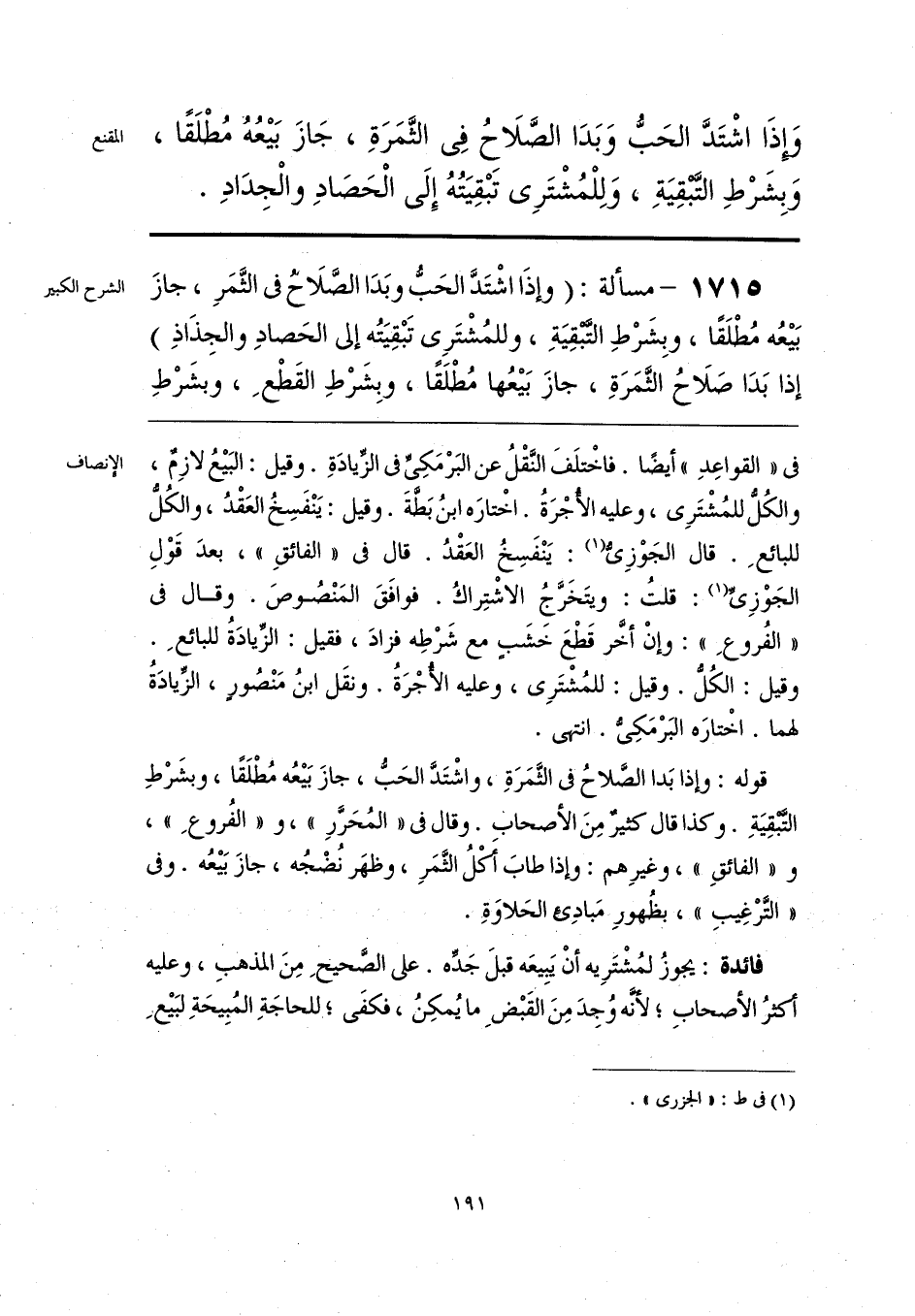 قوله: وإذا بَدا الصَّلاحُ في الثَّمَرَةِ، واشْتَدَّ الحَبُّ، جازَ بَيعُه مُطْلَقًا، وبشَرْطِ التبقِيَةِ. وكذا قال كثير مِنَ الأصحاب. وقال في «المُحَرَّرِ»، و «الفُروعِ»، و «الفائقِ»، وغيرِهم: وإذا طابَ أكْلُ الثَّمَرِ، وظهَر نُضْجُه، جازَ بَيعُه. وفي «التَّرْغِيبِ»، بظُهورِ مَبادِيء الحَلاوَةِ.