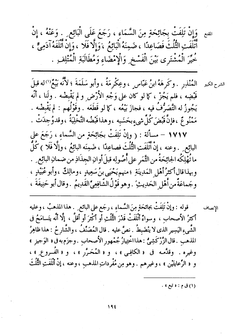 قوله: وإنْ تَلِفَتْ بجائحَةٍ مِنَ السماءِ، رجَع على البائعِ. هذا المذهبُ، وعليه أكثرُ الأصحابِ، وسواء أتْلَفَتْ قَدْرَ الثُّلُثِ أو أكثرَ أو أقلَّ، إلَّا أنَّه يتَسامَحُ في الشَّيءِ اليَسِيرِ الذي لا ينْضَبِطُ. نص عليه. قال المُصَنِّفُ، والشارِحُ: هذا ظاهِرُ المذهبِ. قال الزَّرْكَشِيُّ: هذا اخْتِيارُ جُمْهورِ الأصحابِ. وجزَم به في «الوَجيزِ» وغيرِه. وقدَّمه في «الكافِي»، و «المُحَرَّرِ»، و «الفُروعِ»، و «الرِّعايتَين»، وغيرِهم. وهو مِن مُفْرداتِ المذهبِ، وعنه، إنْ أتْلَفَتِ الثُّلُثَ