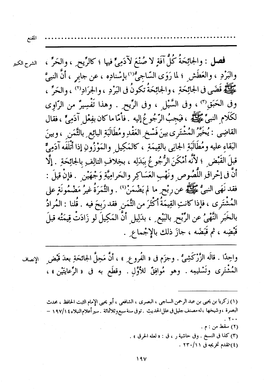 واحِدًا. قاله الزَّرْكَشِيُّ. وجزَم في «الفُروعِ»، أنَّ مَحِلَّ الجائحَةِ بعدَ قَبْضِ المُشْتَرِي وتَسْليمِه. وهو مُوافِق للأوَّلِ. وقطَع به في «الرِّعايتَين»،