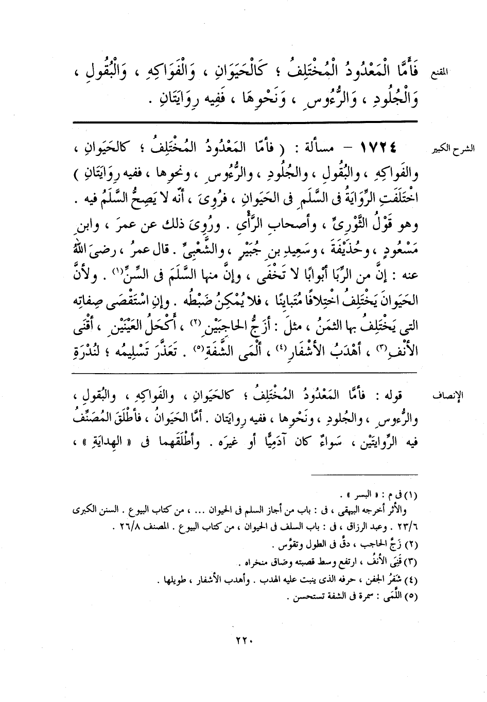 فأمَّا الْمَعْدُودُ الْمُخْتَلِفُ؛ كَالْحَيَوَانِ، وَالْفَوَاكِهِ، وَالْبُقُولِ، وَالْجُلُودِ، وَالرُّءُوسِ، وَنَحوها، فَفِيه رِوَايَتَانِ.