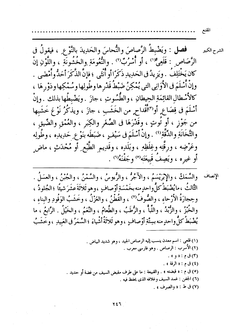 والسَّمَكُ، والإبريسَمُ، والآجُرُّ، والرُّءوسُ، والسَّمْنُ، والجُبْنُ، والعسَلُ. الثَّالثُ، ما يُضْبَطُ كل واحدٍ منه بخَمسَةِ أوْصافٍ، وهو ثَلاثَةَ عشَرَ شيئًا؛ الجُلودُ، وحِجارَةُ الأرحاءِ، والصُّوفُ (¬1)، والقُطْنُ، والغَزْلُ، وخَشَبُ الوَقُودِ والبِناءِ، والخُبْزُ، ولزُّبْدُ، واللِّبأ، والرُّطَبُ، والطَّعامُ، والنَّعَمُ، والخَيلُ. الرّابعُ، ما يُضْبَطُ كلُّ واحدٍ منه بسِتَّةِ أوْصافٍ، وهو ثَلاثةُ أشْياءَ؛ السَّمَرُ في العَبِيدِ، وخشَبُ