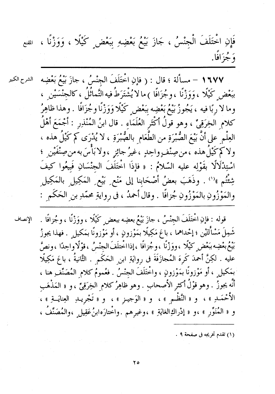 قوله: فإنِ اخْتَلَفَ الجِنْسُ، جازَ بَيعُ بعضِه ببعض كَيلًا، ووَزْنًا، وجُزافًا. شَمِلَ مَسْألتَين؛ إحْداهما، باعَ مَكِيلًا بمَوْزونٍ، أو مَوْزونًا بمَكيلٍ. فهذا يجوزُ بَيعُ بعْضِه ببَعْض كيلًا، ووَزْنًا، وجُزافًا، إذا اخْتلَفَ الجنْسُ، قوْلًا واحِدًا، ونصَّ عليه. لكِنَّ أحمدَ كَرِهَ المُجازَفَةَ في رِوايَةِ ابنِ الحَكَم. الثَّانيةُ، باعَ مَكِيلًا بمَكيلٍ، أو مَوْزونًا بموزونٍ، واخْتَلَفَ الجِنْسُ. فعُمومُ كلامِ المُصَنِّفِ هنا، أنَّه يجوزُ. وهو قوْلُ أكثرِ الأصحابِ. وهو ظاهِرُ كلامِ الخِرَقِيِّ، و «المَذْهَبِ الأحْمَدِ»، و «النَّظْمِ»، و «الوَجيزِ»، و «تَجْرِيدِ العِنايَةِ»، و «المُنَورِ»، و «إدْراكِ الغايَةِ»، وغيرِهم. واخْتارَه ابنُ عَقِيل، والمُصَنِّفُ،