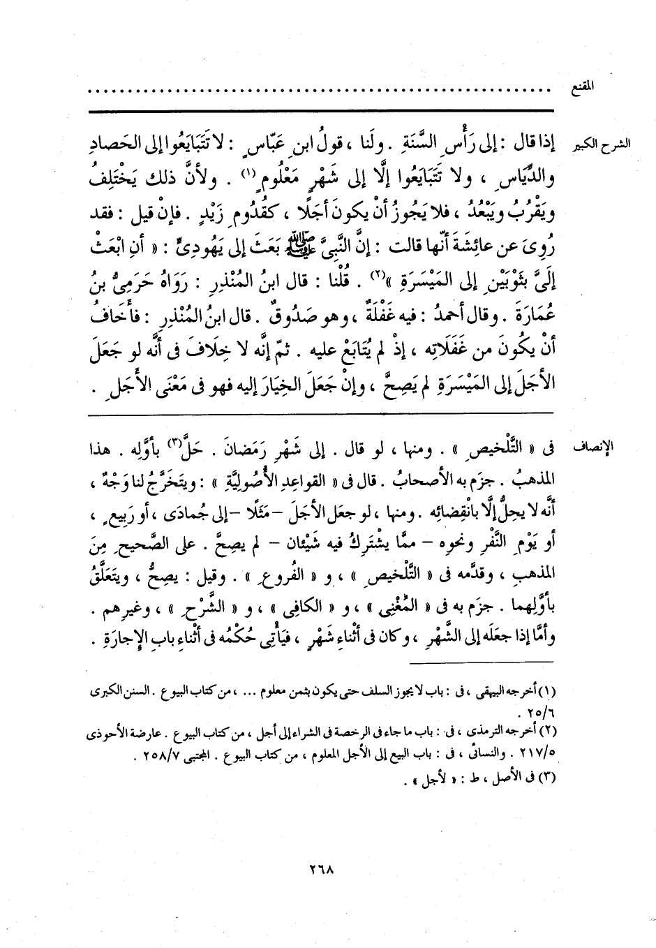 في «التَّلْخيصِ». ومنها، لو قال. إلى شَهْرِ رَمَضانَ. حَلَّ (¬1) بأوَّلِه. هذا المذهبُ. جزَم به الأصحابُ. قال في «القواعِدِ الأصُولِيَّةِ»: ويتَخَرَّجُ لنا وَجْهٌ، أنَّه لا يحِلُّ إلَّا بانْقِضائِه. ومنها، لو جعَل الأجَلَ -مَثَلًا- إلى جُمادَى، أو رَبِيعٍ، أو يَوْمِ النَّفْرِ ونحوه -ممَّا يشْتَرِكُ فيه شَيئان- لم يصِحَّ. على الصَّحيحِ مِنَ المذهبِ، وقدَّمه في «التَّلْخيصِ»، و «الفُروعِ». وقيل: يصِحُّ، ويتَعَلَّقُ بأوَّلِهما. جزَم به في «المُعْنِى»، و «الكافِي»، و «الشَّرْحِ»، وغيرِهم. وأمَّا إذا جعَلَه إلى الشَّهْرِ، وكان في أثْناءِ شَهْرٍ، فيَأْتِي حُكْمُه في أثْناءِ بابِ الإجارَةِ.