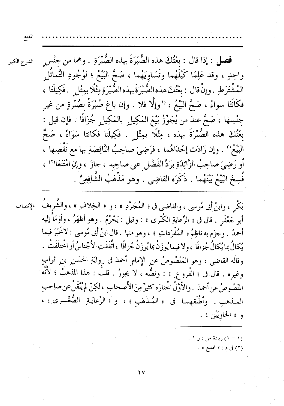 بَكْرٍ، وابنُ أبي مُوسى، والقاضي في «المُجَرَّدِ»، و «الخِلافِ»، والشَّرِيفُ أبو جَعْفَرٍ. قال في «الرِّعايَةِ الكُبْرى»: وقيل: يَحْرُمُ. وهو أظهَرُ، وأوْمَأ إليه أحمدُ. وجزَم به ناظِمُ «المُفْرَداتِ»، وهو منها. قال ابنُ أبي مُوسى: لا خَيرَ فيما يُكالُ بما يُكالُ جُزافًا، ولا فيما يُوزَنُ بما يُوزَنُ جُزافًا، اتَّفَقَتِ الأجْناسُ أو اخْتلَفَتْ. وقاله القاضي، وهو المَنْصُوصُ عنِ الإِمامِ أحمدَ في رِوايَةِ الحسَنِ بنِ ثوابٍ وغيرِه. قال في «الفُروعِ»: ونصُّه، لا يجوزُ. قلتُ: هذا المذهبُ؛ لأنَّه المنْصُوصُ عن أحمدَ. والأوَّلُ اخْتارَه كثيرٌ مِنَ الأصحابِ، لكِنْ لم يُنْقَلْ عن صاحبِ المذهبِ. وأطلَقهما في «المُذْهَبِ»، و «الرِّعايَةِ الصُّغْرى»، و «الحاويَين».