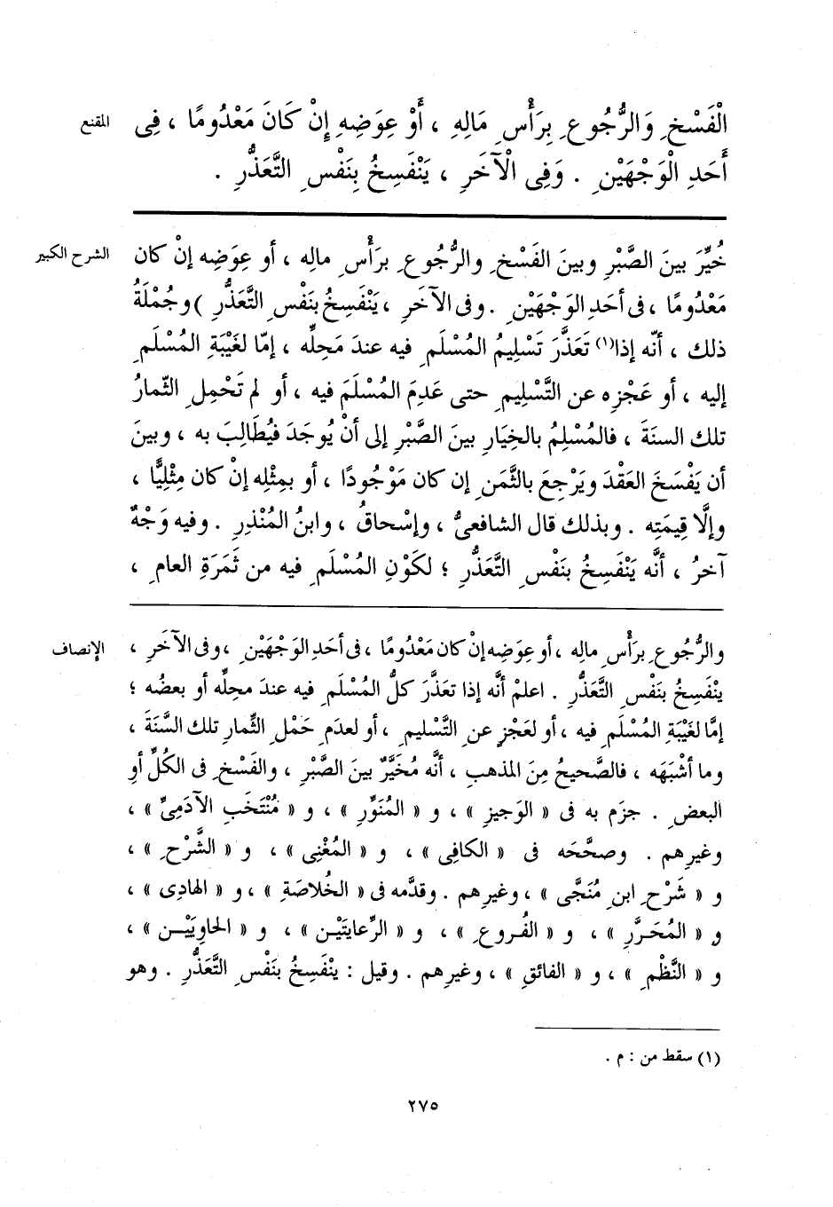 والرُّجُوعِ برَأْسِ مالِه، أو عِوَضِه إنْ كان مَعْدُومًا، في أَحَدِ الوَجْهَينِ، وفي الآخَرِ، ينْفَسِخُ بنَفْسِ التَّعَذُّرِ. اعلمْ أنَّه إذا تعَذَّرَ كلُّ المُسْلَمِ فيه عندَ محِلِّه أو بعضُه؛ إمَّا لغَيبَةِ المُسْلَمِ فيه، أو لعَجْزٍ عنِ التَّسْليمٍ، أو لعدَم حَمْلِ الثِّمارِ تلك السَّنَةَ، وما أشْبَهَه، فالصَّحيحُ مِنَ المذهبِ، أنَّه مُخَيَّرٌ بينَ الصَّبْرِ، والفَسْخِ في الكُلِّ أو البعضِ. جزَم به في «الوَجيزِ»، و «المُنَوِّرِ»، و «مُنْتَخَبِ الآدَمِيِّ»، وغيرِهم. وصحَّحَه في «الكافِي»، و «المُغْنِي»، و «الشَّرْحِ»، و «شَرْحِ ابنِ مُنَجَّى»، وغيرِهم. وقدَّمه في «الخُلاصَةِ»، و «الهادِي»، و «المُحَرَّرِ»، و «الفُروعِ»، و «الرِّعايتَين»، و «الحاويَيْن»، و «النَّظْمِ»، و «الفائقِ»، وغيرِهم. وقيل: ينْفَسِخُ بنَفْسِ التَّعَذُّرِ. وهو