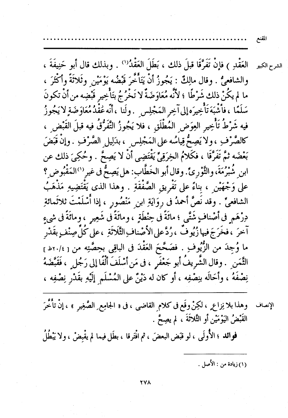 وهذا بلا نِزاعٍ، لكِنْ وقَع في كلامِ القاضي، في «الجامِعِ الصَّغِيرِ»، إنْ تأَخَّرَ القَبْضُ اليَوْمَين أو الثَّلاثَةَ، لم يصِحُّ.