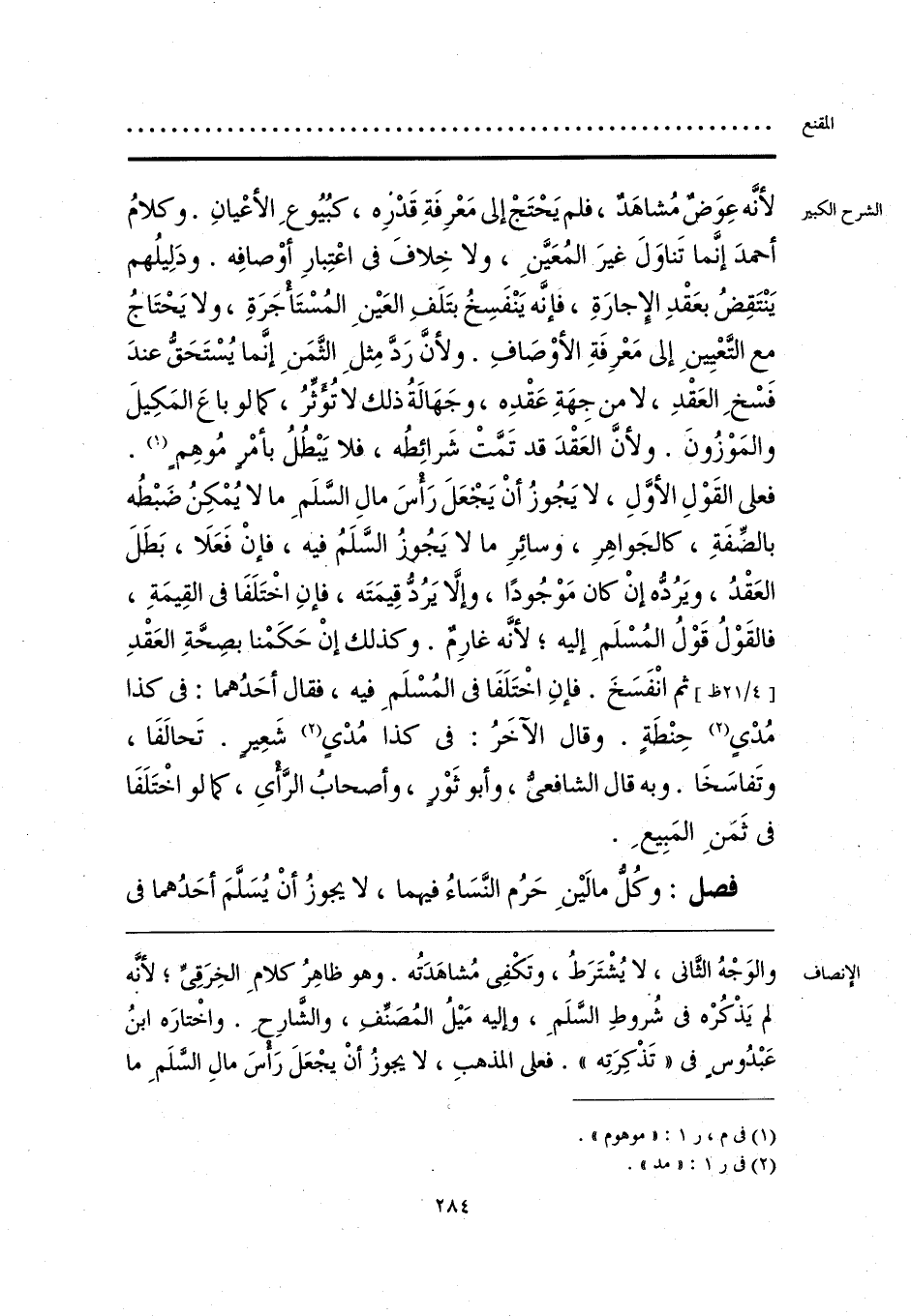 والوَجْهُ الثَّاني، لا يُشْتَرَطُ، وتَكْفِي مُشاهَدَتُه. وهو ظاهِرُ كلامِ الخِرَقِيِّ؛ لأنَّه لم يَذْكُرْه في شُروطِ السَّلَمِ، وإليه مَيلُ المُصَنِّفِ، والشَّارِحِ. واخْتارَه ابنُ عَبْدُوسٍ في «تَذْكِرَتِه». فعلى المذهبِ، لا يجوزُ أنْ يجْعَلَ رَأْسَ مالِ السَّلَمِ ما