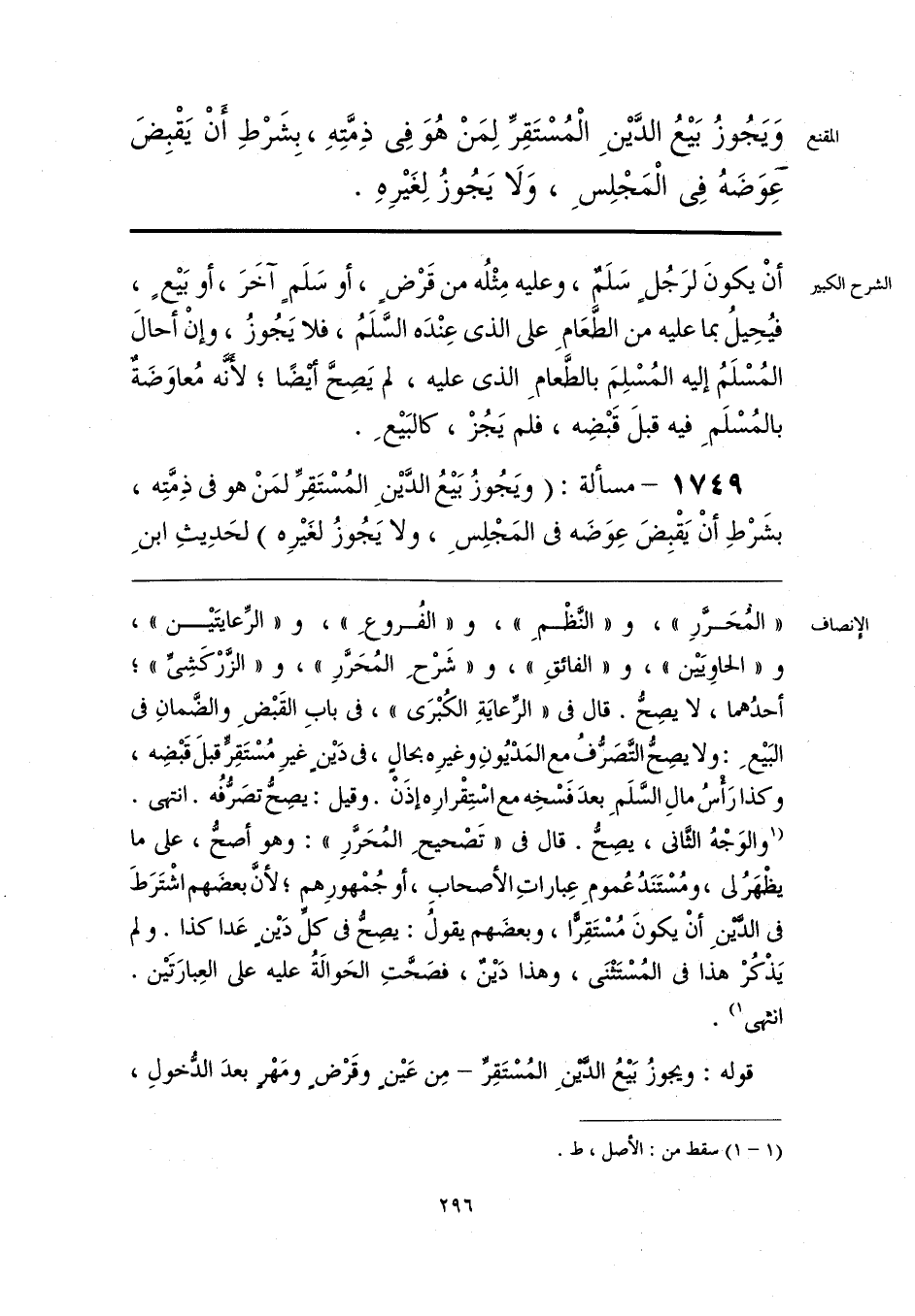 «المُحَرَّرِ»، و «النَّظْمِ»، و «الفُروعِ»، و «الرِّعايتَين»، و «الحاويَيْن»، و «الفائقِ»، و «شَرْحِ المُحَرَّرِ»، و «الزَّرْكَشِيِّ»؛ أحدُهما، لا يصِحُّ. قال في «الرِّعايَةِ الكُبْرَى»، في بابِ القَبْضِ والضَّمانِ في البَيعِ: ولا يصِحُّ التَّصَرُّفُ مِع المَدْيُونِ وغيرِه بحالٍ، في دَينٍ غيرِ مُسْتَقِرٍّ قبلَ قَبْضِه، وكذا رَأْسُ مالِ السَّلَمِ بعدَ فسْخِه مع اسْتِقْرارِه إذَنْ. وقيل: يصِحُّ تصَرُّفُه. انتهى. [والوَجْهُ الثَّاني، يصِحُّ. قال في «تَصْحيحِ المُحَرَّرِ»: وهو أصحُّ، على ما يظْهَرُ لي، ومُسْتَنَدُ عُمومِ عِباراتِ الأصحابِ، أو جُمْهورِهم؛ لأنَّ بعضَهم اشْتَرَطَ في الدَّينِ أنْ يكونَ مُسْتَقِرًّا، وبعضَهم يقولُ: يصِحُّ في كلِّ دَينٍ عَدا كذا. ولم يَذْكُرْ هذا في المُسْتَثْنَى، وهذا دَينٌ، فصَحَّتِ الحَوالةُ عليه على العِبارَتَين. انتهى] (¬1).