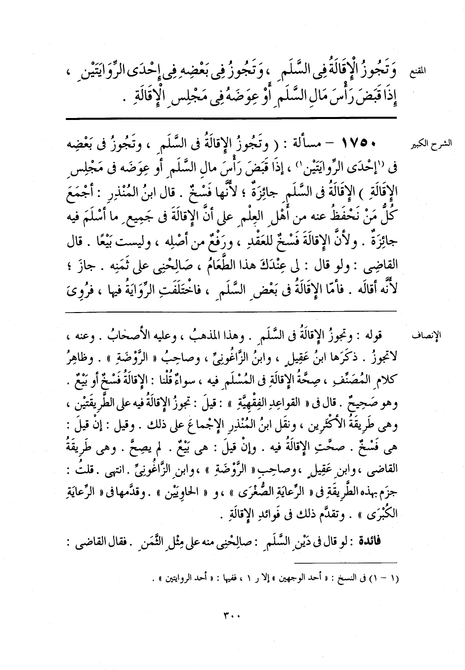 قوله: وتجوزُ الإِقالةُ في السَّلَمِ. وهذا المذهبُ، وعليه الأصحابُ. وعنه، لا تجوزُ. ذكَرَها ابنُ عَقِيلٍ، وابنُ الزَّاغُونِيِّ، وصاحِبُ «الرَّوْضَةِ». وظاهِرُ كلامِ المُصَنِّفِ، صِحَّةُ الإِقالةِ في المُسْلَمِ فيه، سواءٌ قُلْنا: الإِقالةُ فَسْخٌ أو بَيعٌ. وهو صَحِيحٌ. قال في «القواعِدِ الفِقْهِيَّةِ»: قيلَ: تجوزُ الإِقالةُ فيه على الطَّرِيقَتين، وهي طَرِيقَةُ الأكْثَرِين، ونقَل ابنُ المُنْذِرِ الإِجْماعَ على ذلك. وقيل: إنْ قيلَ: هي فَسْخٌ. صحَّتِ الإِقالةُ فيه. وإنْ قيلَ: هي بَيعٌ. لم يصِحَّ. وهي طَرِيقَةُ القاضي، وابنِ عَقِيلٍ، وصاحِبِ «الرَّوْضَةِ»، وابنِ الزَّاغُونِيِّ. انتهى. قلتُ: جزَم بهذه الطَّرِيقَةِ في «الرِّعايَةِ الصُّغْرَى»، و «الحاويَيْن». وقدَّمها في «الرِّعايَةِ الكُبْرَى». وتقدَّم ذلك في فَوائدِ الإِقالةِ.