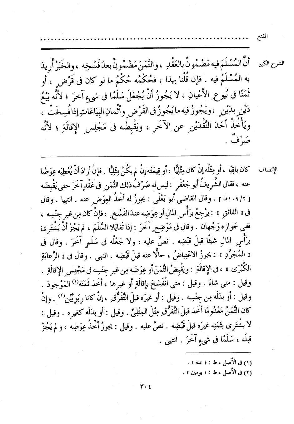كان باقِيًا، أو مِثْلَه إنْ كان مِثْلِيًّا، أو قِيمَتَه إنْ لم يكُنْ مِثْلِيًّا. فإنْ أرادَ أنْ يُعْطِه عِوَضًا عنه، فقال الشَّرِيفُ أبو جَعْفَرٍ: ليس له صَرْفُ ذلك الثَّمَنِ في عَقْدٍ آخَرَ حتى يَقْبِضَه وقال القاضي أبو يَعْلَى: يجوزُ له أخْذُ العِوَضِ عنه. انتهيا. وقال في «الفائقِ»: يرْجِعُ برَأْسِ المالِ أو عِوَضِه عندَ الفَسْخِ، فإنْ كان مِن غيرِ جِنْسِه، ففي جَوازِه وَجْهان. وقال في مَوْضِعٍ آخَرَ: إذا تَقايَلا السَّلَمَ، لم يَجُزْ أنْ يَشْتَرِيَ برَأْسِ المالِ شيئًا قبلَ قبْضِه. نصَّ عليه، ولا جَعْلُه في سَلَمٍ آخَرَ. وقال في «المُجَرَّدِ»: فيجوزُ الاعْتِياضُ، حالًّا عنه قبلَ قَبْضِه. انتهى. وقال في «الرِّعايَةِ الكُبْرَى»، في الإِقالةِ: ويَقْبِضُ الثَّمَنَ أو عِوَضَه مِن غيرِ جِنْسِه في مَجْلِسِ الإِقالةِ. وقيل: متى شاءَ. وقيل: متى انْفَسَخَ بإِقالةٍ أو غيرِها، أخَذ ثَمَنَه (¬1) المَوْجودَ. وقيل: أو بدَلَه مِن جنْسِه. وقيل: أو غيرَه قبلَ التّفَرُّقِ، إنْ كانا رِبَويَّيْن (¬2). وإنْ كان الثَّمَنُ مَعْدُومًا أخَذ قبلَ التَّفَرُّقِ مِثْلَ المِثْلِيِّ. وقيل: أو بدَلَه كغيرِه. وقيل: لا يشْتَرِي بثَمَنِه غيرَه قبلَ قَبْضِه. نصَّ عليه. وقيل: يجوزُ أخْذُ عِوَضِه، ولم يَجُزْ قبلَه، سَلَمًا في شيءٍ آخَرَ. انتهى.