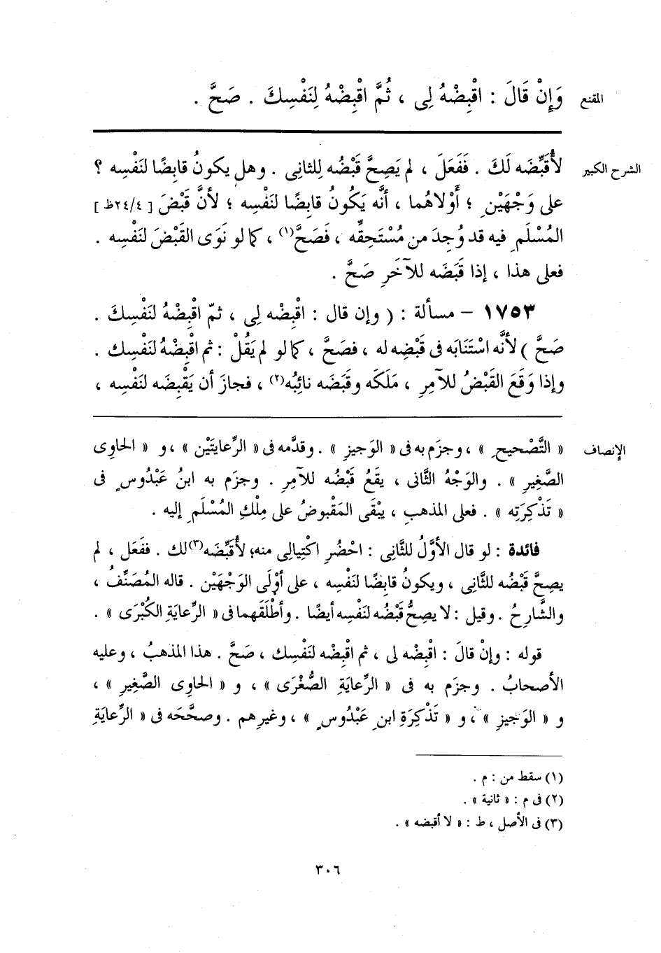 «التصْحيحِ»، وجزَم به في «الوَجيزِ». وقدَّمه في «الرِّعايتَين»، و «الحاوي الصَّغِيرِ». والوَجْهُ الثَّاني، يقَعُ قَبْضُه للآمِرِ. وجزَم به ابنُ عَبْدُوسٍ في «تَذْكِرَتِه». فعلى المذهبِ، يبْقَى المَقْبوضُ على مِلْكِ المُسْلَمِ إليه.