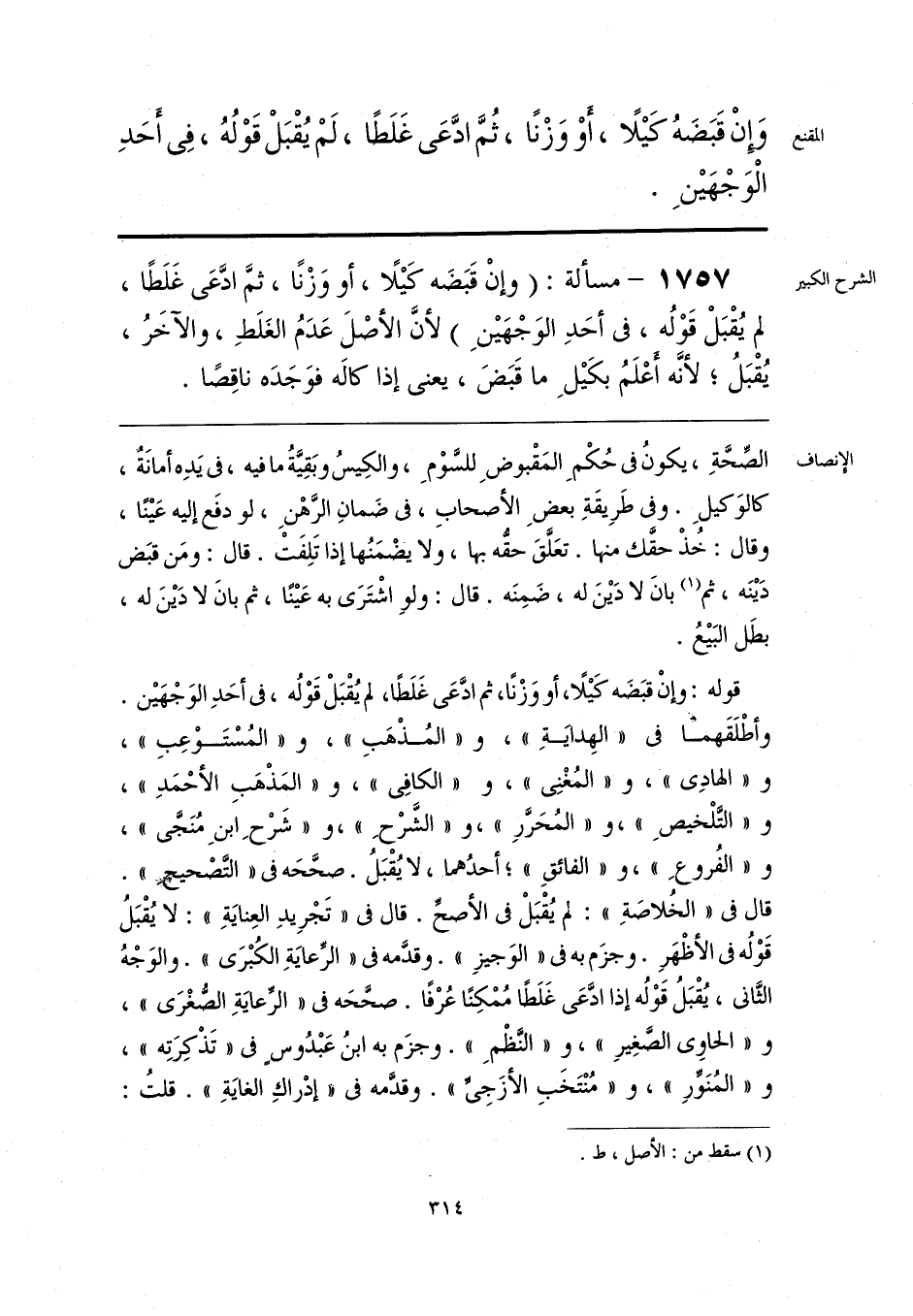 قوله: وإنْ قبَضَه كَيلًا، أو وَزْنًا، ثم ادَّعَى غَلَطًا، لم يُقْبَلْ قَوْلُه، في أحَدِ الوَجْهَين. وأطْلَقَهما في «الهِدايَةِ»، و «المُذْهَبِ»، و «المُسْتَوْعِبِ»، و «الهادِي»، و «المُغْنِي»، و «الكافِي»، و «المَذْهَبِ الأحْمَدِ»، و «التّلْخيصِ»، و «المُحَرَّرِ»، و «الشَّرْحِ»، و «شَرْحِ ابنِ مُنَجَّى»، و «الفُروعِ»، و «الفائقِ»؛ أحدُهما، لا يُقْبَلُ. صحَّحَه في «التَّصْحيحِ». قال في «الخُلاصَةِ»: لم يُقْبَلْ في الأصحِّ. قال في «تَجْرِيدِ العِنايَةِ»: لا يُقْبَلُ قَوْلُه في الأظْهَرِ. وجزَم به في «الوَجيزِ». وقدَّمه في «الرِّعايَةِ الكُبْرَى». والوَجْهُ الثَّاني، يُقْبَلُ قَوْلُه إذا ادَّعَى غَلَطًا مُمْكِنًا عُرْفًا. صحَّحَه في «الرِّعايَةِ الصُّغْرَى»، و «الحاوي الصَّغِيرِ»، و «النَّظْمِ». وجزَم به ابنُ عَبْدُوسٍ في «تَذْكِرَتِه»، و «المُنَوِّرِ»، و «مُنْتَخَبِ الأزَجِيِّ». وقدَّمه في «إدْراكِ الغايَةِ». قلتُ: