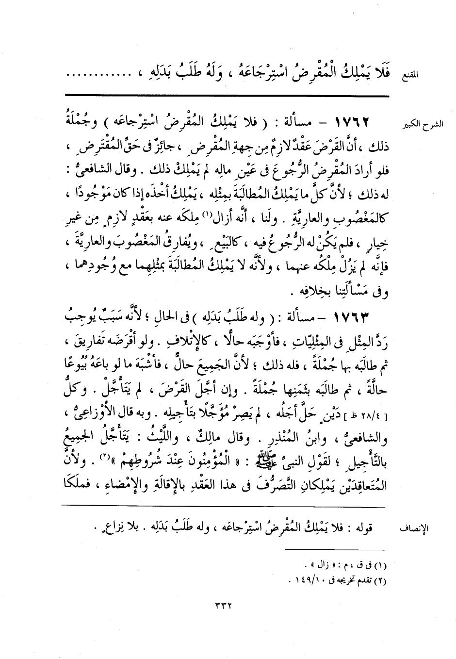 قوله: فلا يَمْلِكُ المُقْرِضُ اسْتِرْجاعَه، وله طَلَبُ بَدَلِه. بلا نِزاعٍ.