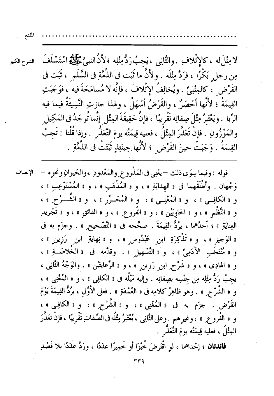 قوله: وفيما سِوَى ذلك -يعْنِي في المَذْروعِ والمَعْدودِ، والحَيوانِ ونحوه- وَجْهان. وأطْلَقَهما في «الهِدايَةِ»، و «المُذْهَبِ»، و «المُسْتَوْعِبِ»، و «الكافِي»، و «المُغْنِي»، و «المُحَرَّرِ»، و «الشَّرْحِ»، و «النَّظْمِ»، و «الحاويَيْن»، و «الفُروعِ»، و «الفائقِ»، و «تجْريدِ العِنايَةِ»؛ أحدُهما، يرُدُّ القِيمَةَ. صحَّحه في «التَّصْحيحِ». وجزَم به في «الوَجيزِ»، و «تَذْكِرَةِ ابنِ عَبْدُوسٍ»، و «نِهايةِ ابنِ رَزِينٍ»، و «مُنْتَخَبِ الآدَمِيِّ»، و «التَّسْهيلِ». وقدَّمه في «الخُلاصَةِ»، و «الهادِي»، و «شَرْحِ ابنَ رَزِينٍ»، و «الرِّعايتَين». والوَجْهُ الثَّانِي، يجِبُ رَدُّ مِثْلِه مِن جِنْسِه بصِفاتِه. وإليه مَيلُه في «الكافِي»، و «المُغْنِي»، و «الشَّرْحِ». وهو ظاهِرُ كلامِه في «العُمْدَةِ». فعلى الأوَّلِ، يرُدُّ القِيمَةَ يَوْمَ القَرْضِ. جزَم به في «المُغْنِي»، و «الشَّرْحِ»، و «الكافِي»، و «الفُروعِ»، وغيرِهم. وعلى الثَّانِي، يُعْتَبرُ مِثْلُه في الصِّفاتِ تَقْرِيبًا، فإنْ تعَذَّرَ المِثْلُ، فعليه قِيمَتُه يومَ التَّعَذُّرِ.