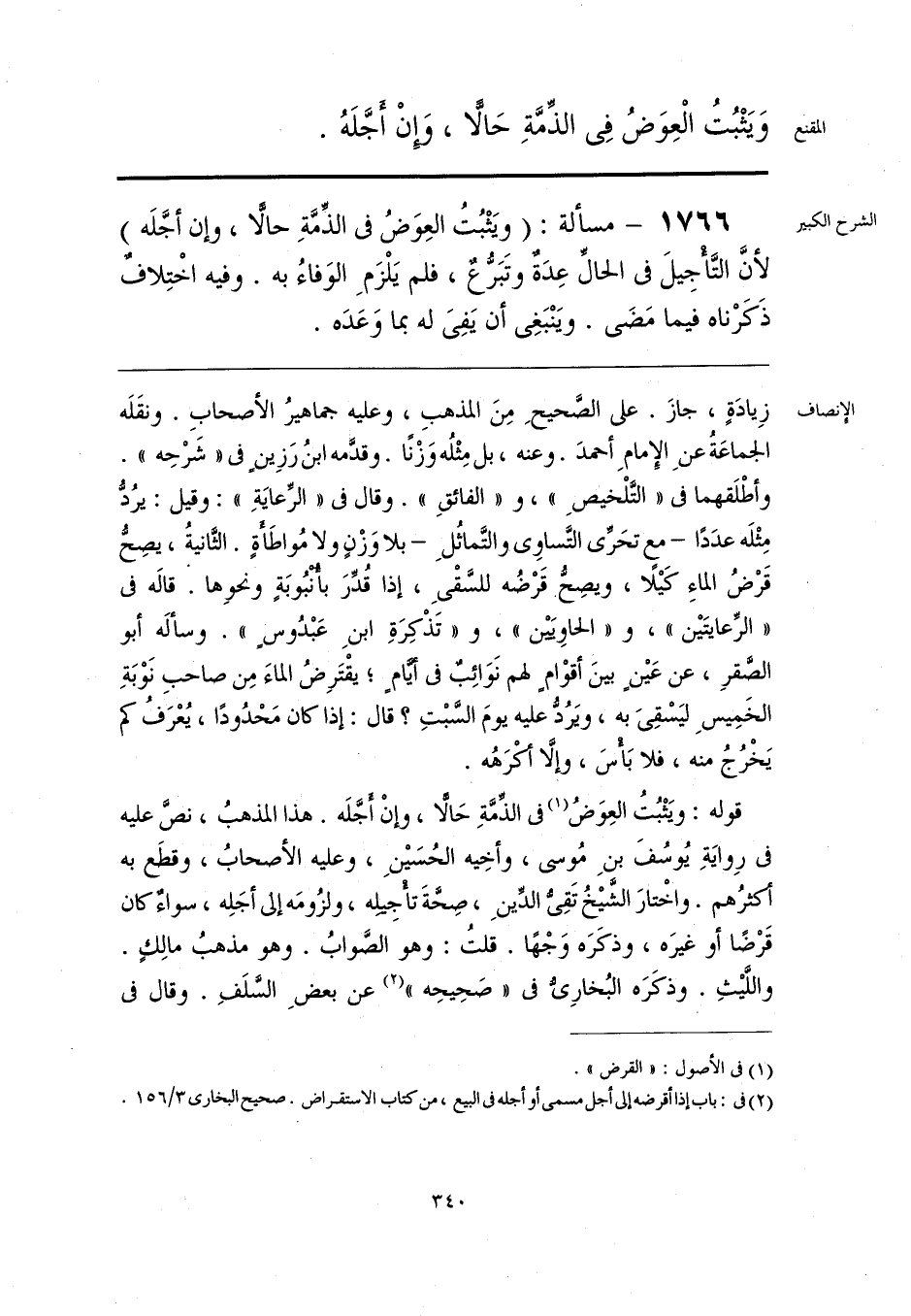 قوله: ويَثْبُتُ العِوَضُ (¬1) في الذِّمَّةِ حَالًّا، وإنْ أَجَّلَه. هذا المذهبُ، نصَّ عليه في رِوايَةِ يُوسُفَ بنِ مُوسى، وأخِيه الحُسَينِ، وعليه الأصحابُ، وقطَع به أكثرُهم. واخْتارَ الشَّيخُ تَقِيُّ الدِّينِ، صِحَّةَ تأْجِيلِه، ولزُومَه إلى أجَلِه، سواءٌ كان قَرْضًا أو غيرَه، وذكَرَه وَجْهًا. قلتُ: وهو الصَّوابُ. وهو مذهبُ مالِكٍ. واللَّيثِ. وذكَرَه البُخارِيُّ في «صَحِيحِه» (¬2) عن بعضِ السَّلَفِ. وقال في