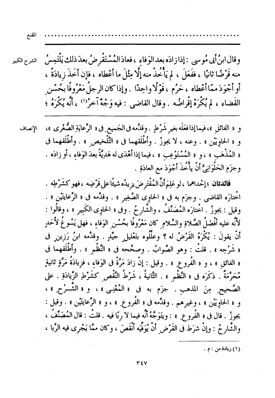 فائدتان؛ إحْداهما، لو عَلِمَ أنَّ المُقْتَرِضَ يزِيدُه شيئًا على قَرْضِه، فهو كشَرْطِه. اخْتارَه القاضي. وجزَم به في «الحاوي الصَّغِيرِ». وقدَّمه في «الرِّعايتَين». وقيل: يجوزُ. اخْتارَه المُصَنِّفُ، والشَّارِحُ. وفي «الحاوي الكَبِيرِ»، وقالُوا: لأنَّه عليه أفْضَلُ الصَّلاةِ والسَّلامِ كان مَعْرُوفًا بحُسْنِ الوَفاءِ، فهل يَسُوغُ لأحَدٍ أنْ يقولَ: يُكْرَهُ القَرْضُ له؟ وعلَّلُوه بتَعْليلٍ جيِّدٍ. وقدَّمه ابنُ رَزِينٍ في «شَرْحِه». قلتُ: وهو الصَّوابُ. وصحَّحه في «النَّظْمِ». وأطْلَقهما في «الفائقِ»، و «الفُروعِ». وقيل: إنْ زادَ مَرَّةً في الوَفاءِ، فزِيادَةُ مَرَّةٍ ثانيةٍ مُحَرَّمَةٌ. ذكَرَه في «النَّظْمِ». الثانيةُ، شَرْطُ النَّقْصِ كشَرْطِ الزِّيادَةِ. على الصَّحيحِ مِنَ المذهبِ. جزَم به في «المُغْنِي»، و «الشَّرْحِ»، و «الحاويَيْن»، وغيرِهم. وقدَّمه في «الفُروعِ»، و «الرِّعايتَين». وقيل: يجوزُ. قال في «الفُروعِ»: ويتَوَجّهُ أنَّه فيما لا رِبًا فيه. قلتُ: قال المُصَنِّفُ، والشَّارِحُ: وإنْ شرَط في القَرْضِ أنْ يُوَفِّيَه أنْقَصَ، وكان ممَّا يَجْرِي فيه الرِّبا،