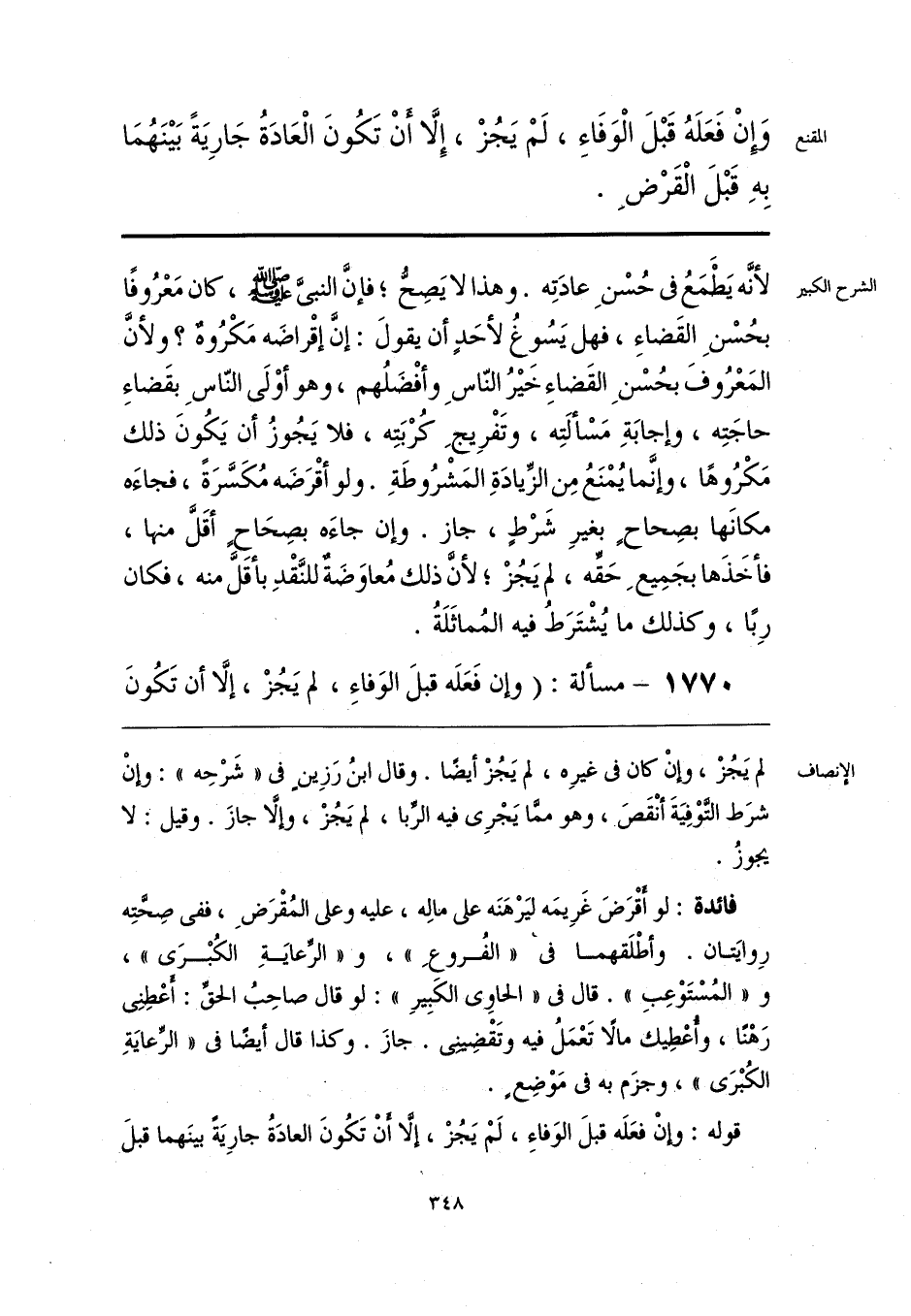 وَإِنْ فَعَلَهُ قَبْلَ الْوَفَاءِ، لَمْ يَجُزْ، إلا أنْ تَكُونَ الْعَادَةُ جَارِيَةً بَينَهُمَا بِهِ قَبْلَ الْقَرْضِ.