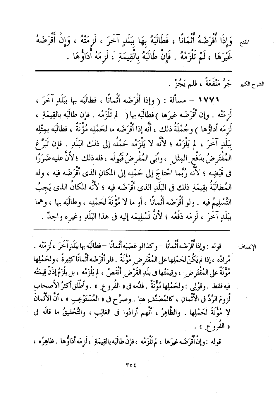 قوله: وإذا أَقْرَضَه أثْمانًا -وكذا لو غصَبَه أثْمانًا- فطالبَه بها ببَلَدٍ آخَرَ، لَزِمَتْه. مُرادُه، إذا لم يَكُنْ لحَمْلِها على المُقْتَرِضِ مُؤْنَةٌ. فلو أقْرَضَه أثْمانًا كثِيرةً، ولحَمْلِها مُؤْنَةٌ على المُقْتَرِضِ، وقِيمَتُها في بلَدِ القَرْضِ أنْقَصُ، لم يَلْزَمْه، بل يلْزَمُ إذَنْ قِيمَتُه فيه فقط. وقوْلِي: ولحَمْلِها مُؤْنَةٌ. قدَّمه في «الفُروعِ». وأطْلَق أكثرُ الأصحابِ لُزومَ الرَّدِّ في الأثْمانِ، كالمُصَنِّفِ هنا. وصرَّح في «المُسْتَوْعِبِ»، أنَّ الأثْمانَ لا مُؤْنَةَ لحَمْلِها. والظَّاهِرُ، أنَّهم أرادُوا في الغالِبِ، والتَّحْقيقُ ما قاله في «الفُروعِ».