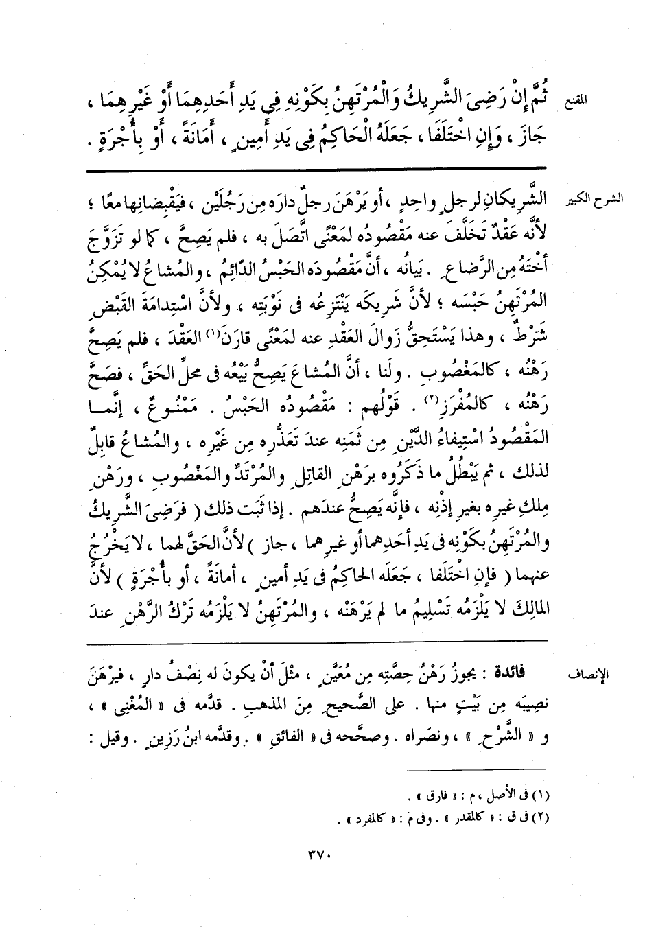 فائدة: يجوزُ رَهْنُ حِصَّتِه مِن مُعَيَّن، مثْلَ أن يكونَ له نِصْفُ دار، فيرْهَنَ نصِيبَه مِن بَيتٍ منها. على الصَّحيحِ مِنَ المذهبِ. قدَّمه في «المُغْنِي»، و «الشَّرْحِ»، ونصَراه. وصحَّحه في «الفائقِ». وقدَّمه ابنُ رَزِين. وقيل: