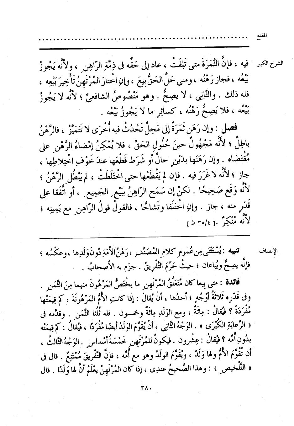 فائدة: متى بِيعا كان مُتَعَلَّقُ المُرْتَّهِنِ ما يخْتَّص المَرْهُونَ منهما مِنَ الثَّمَنِ. وفي قَدْرِه ثَلاثةُ أوْجُهٍ؛ أحدُها، أن يُقال: إذا كانتِ الأمُّ المَرْهُونَةَ، كم قِيمَتُها مُفْرَدَة؟ فيُقالُ: مِائَة، ومع الوَلَدِ مِائَة وخمسون. فله ثُلُثا الثَّمَنِ. وقدمه في «الرِّعايَةِ الكُبْرَى». الوَجْهُ الثَّانِي، أن يُقَومَ الوَلَدُ أيضًا مُفْرَدًا، فيُقالُ: كم قِيمَتُه بدُونِ أُمِّه؟ فيُقالُ: عِشْرون. فيكونُ للمُرتَهِنِ خَمْسَةُ أسْداس. الوَجْهُ الثَّالثُ، أن تُقُومَ الأمُّ ولها وَلَدٌ، ويُقَومَ الولَدُ وهو مع أُمِّه، فأنَّ التَّفْريقَ مُمْتَنِعٌ. قال في «التَّلْخيصِ»: وهذا الصحيحُ عندِي، إذا كان المُرْتَهِنُ يعْلَمُ أن لها وَلَدًا. قال