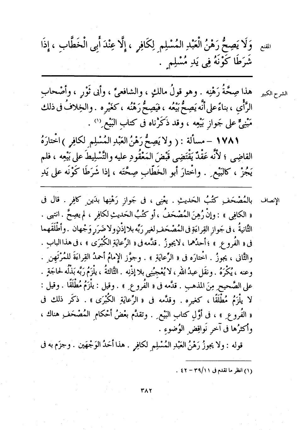 بالمُصْحَفِ كتُبُ الحَديثِ. يعْنِي، في جَوازِ رَهْنِها بدَينِ كافِر. قال في «الكافي»: وإنْ رُهِنَ المُصْحَفُ، أو كتُبُ الحَديثِ لكافِر، لم يصِحَّ. انتهى. الثَّانيةُ، في جَوازِ القِراءَةِ في المُصْحَفِ لغيرِ رَبِّه بلا إذْنٍ ولا ضَرَرٍ وَجْهان. وأطْلَقَهما في «الفُروعِ»؛ أحدُهما، لا يجوزُ. قدَّمه في «الرِّعايَةِ الكُبْرَى»، في هذا البابِ. والثَّاني، يجوزُ. اخْتارَه في «الرِّعايَةِ». وجوَّز الإمامُ أحمدُ القِراءَةَ للمُرْتَهِنِ. وعنه، يُكْرَهُ. ونقَل عبدُ الله، لا يُعْجِبُنِي بلا إذْنِه. الثَّالثةُ، يلْزَمُ رَبِّه بَذْلُه لحاجَةٍ. على الصَّحيحِ مِنَ المذهبِ. قدَّمه في «الفُروعِ». وقيل: يلْزَمُ مُطْلَقًا. وقيل: لا يلْزَمُ مُطْلَقًا، كغيرِه. وقدَّمه في «الرِّعايَةِ الكُبْرَى». ذكَر ذلك في «الفُروعِ»، في أوَّلِ كتابِ البَيعِ. وتقدَّم بعْضُ أحْكامِ المُصْحَفِ هناك، وأكثرُها في آخرِ نَواقِضَ الوُضوءِ.