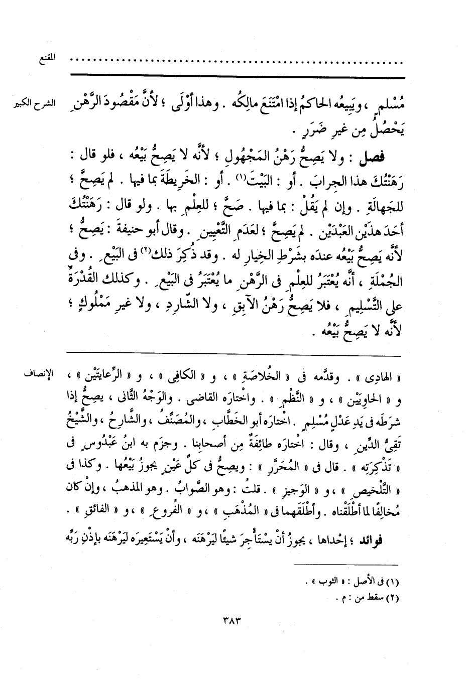 «الهادِي». وقدَّمه في «الخُلاصَةِ»، و «الكافِي»، و «الرِّعايتَين»، و «الحاويَيْن»، و «النَّظْمِ». واخْتارَه القاضي. والوَجْهُ الثَّاني، يصِحُّ إذا شرَطَه في يَدِ عَدْلٍ مُسْلِم. اخْتارَه أبو الخَطَّابِ، والمُصَنِّفُ، والشَّارِحُ، والشَّيخُ تَقِيُّ الدِّينِ، وقال: اخْتارَه طائِفَةٌ مِن أصحابِنا. وجزَم به ابنُ عَبْدُوس عن «تَذْكِرَتِه». قال في «المُحَررِ»: ويصِحُّ في كلِّ عَين يجوزُ بَيعُها. وكذا في «التَّلْخيص»، و «الوَجيزِ» (1). قلتُ: وهو الصَّوابُ. وهو المذهبُ، وإنْ كان مُخالِفًا لما أطْلَقْناه. وأطْلَقَهما في «المُذْهَبِ»، و «الفُروعِ»، و «الفائقِ».