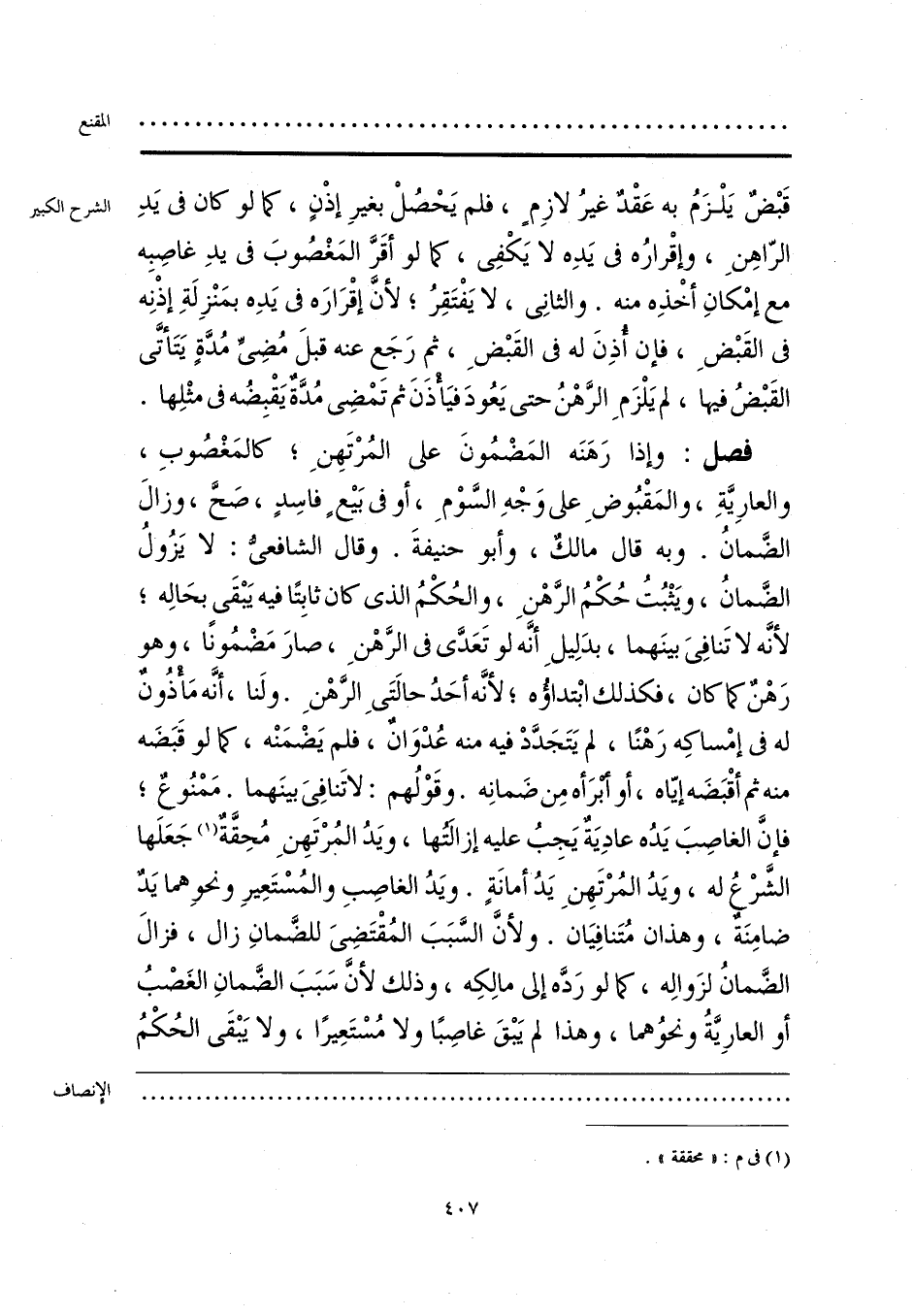 فصل: وإذا رَهَنَه المَضْمُونَ على المُرْتَهن؛ كالمَغْصُوبِ، والعارِيَّةِ، والمَقْبُوضِ على وَجْهِ السَّوْمِ، أو في بَيع فاسِدٍ، صَحَّ، وزاكَ الضَّمانُ. وبه قال مالكٌ، وأبو حنيفةَ. وقال الشَّافعي: لا يَزُولُ الضَّمانُ، ويَثْبُتُ حُكْمُ الرَّهْنِ، والحُكْمُ الذي كان ثابِتًا فيه يَبْقَى بحَالِه؛ لأنَّه لا تَنافِيَ بينَهما، بدَلِيلِ أنَّه لو تَعَدَّى في الرَّهْنِ، صارَ مَضْمُونًا، وهو رَهْنٌ كما كان، فكذلك ابْتداؤه؛ لأنَّه أحَدُ حالتَيِ الرَّهْنِ. ولَنا، أنَّه مَأذُونٌ له في إمْساكِه رَهْنًا، لم يَتَجَدَّدْ فيه منه عُدْوَانٌ، فلم يَضْمَنْه، كما لو قَبَضَه منه ثم أقْبَضَه إيّاه، أو أبرَأه مِن ضَمانِه. وقَوْلُهم: لا تَنافِيَ بينَهما. مَمْنُوعٌ؛ فإن الغاصِبَ يَدُه عادِيَةٌ يَجِبُ عليه إزالتها، ويَدُ المُرْتَّهِنِ مُحِقَّةٌ (¬1) جَعَلَها الشَّرْع له، ويَدُ المُرْتَّهِنِ يَدُ أمانَةٍ. ويَدُ الغاصِبِ والمُسْتَعِيرِ ونحوهما يَدٌ ضامِنَةٌ، وهذان مُتَنافِيَان. ولأنَّ السَّبَبَ المُقْتَضِيَ للضَّمانِ زال، فزال الضَّمانُ لزَوالِه، كما لو رَدَّه إلى مالِكِه، وذلك لأنَّ سَبَبَ الضَّمانِ الغَصْبُ أو العارِيَّةُ ونحوُهما، وهذا لم يَبْقَ غاصِبًا ولا مُسْتَعِيرًا، ولا يَبْقَى الحُكْمُ