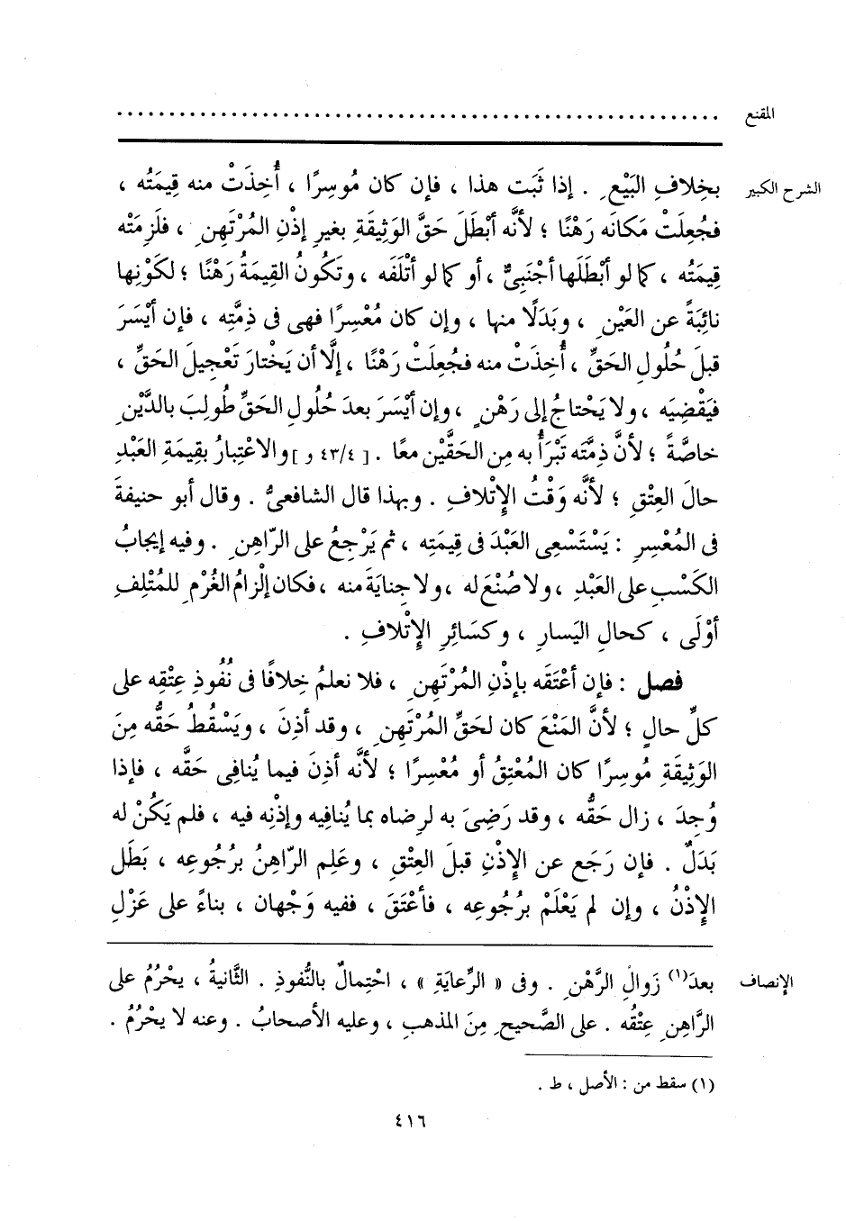 بعدَ (¬1) زَوال الرهْنِ. وفي «الرِّعايَةِ»، احْتِمالٌ بالنُّفوذِ. الثَّانيةُ، يحْرُمُ على الرَّاهِنِ عِتْقُه. على الصَّحيحِ مِنَ المذهبِ، وعليه الأصحابُ. وعنه لا يحْرُمُ.