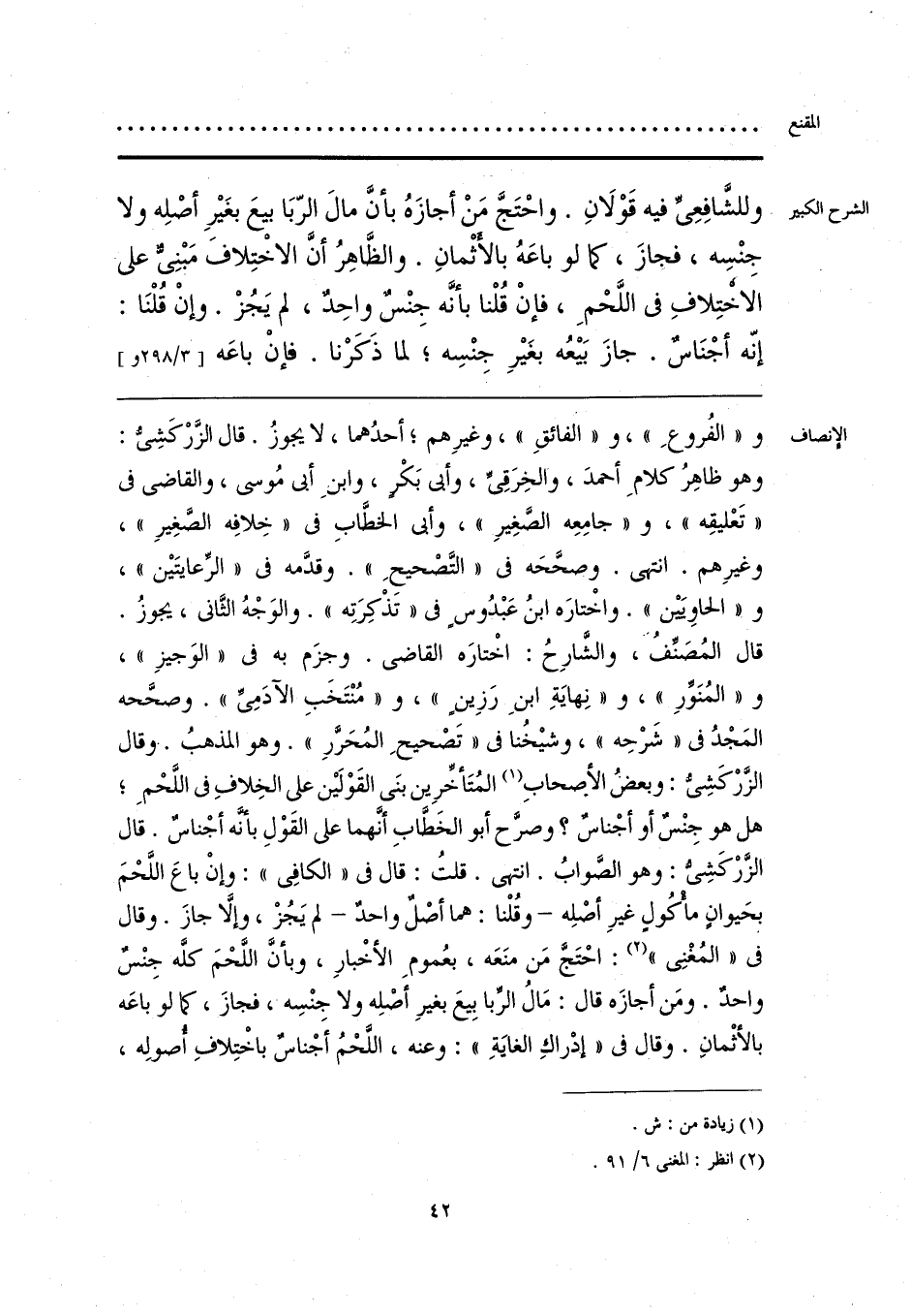 و «الفُروعِ»، و «الفائقِ»، وغيرِهم، أحدُهما، لا يجوزُ. قال الزَّرْكَشِيُّ: وهو ظاهِرُ كلامِ أحمدَ، والخِرَقِيِّ، وأبي بَكْرٍ، وابنِ أبي مُوسى، والقاضي في «تَعْليقِه»، و «جامِعِه الصَّغِيرِ»، وأبي الخطَّابِ في «خِلافِه الصَّغِيرِ»، وغيرِهم. انتهى. وصحَّحَه في «التَّصْحيحِ». وقدَّمه في «الرعايتَين»، و «الحاويَين». واخْتارَه ابنُ عَبْدُوس في «تذكِرَتِه». والوَجْهُ الثَّاني، يجوزُ. قال المُصَنِّفُ، والشَّارِحُ: اخْتارَه القاضي. وجزَم به في «الوَجيزِ»، و «المُنَوِّرِ»، و «نِهايَةِ ابنِ رَزِينٍ»، و «مُنْتَخَبِ الآدَمِيِّ». وصحَّحه المَجْدُ في «شَرْحِه»، وشيخُنا في «تَصْحيحِ المُحَرَّرِ». وهو المذهبُ. وقال الزَّرْكَشِيُّ: وبعضُ الأصحابِ (¬1) المُتَأخِّرِين بنَى القَوْلَين على الخِلافِ في اللَّحْمِ، هل هو جِنْسٌ وأجْناسٌ؛ وصرَّح أبو الخَطَّابِ أنَّهما على القَوْلِ بأنَّه أجْناسٌ. قال الزَّرْكَشِيُّ: وهو الصَّوابُ. انتهى. قلتُ: قال في «الكافِي»: وإنْ باعَ اللَّحْمَ بحَيوانٍ مأْكُولٍ غيرِ أصْلِه -وقُلْنا: هما أصْلٌ واحدٌ- لم يَجُزْ، وإلَّا جازَ. وقال في «المُغْنِي» (¬2): احْتَجَّ مَن منَعَه، بعُموم الأخْبارِ، وبأنَّ اللَّحْمَ كلَّه جِنْس واحدٌ. ومَن أجازَه قال: مَالُ الرِّبا بِيعَ بغيرِ أَصْلِه ولا جنْسِه، فجازَ،؛ لو باعَه بالأثْمانِ. وقال في «إدْراكِ الغايَةِ»: وعنه، اللَّحْمُ أَجْناسٌ باخْتِلافِ أُصولِه،