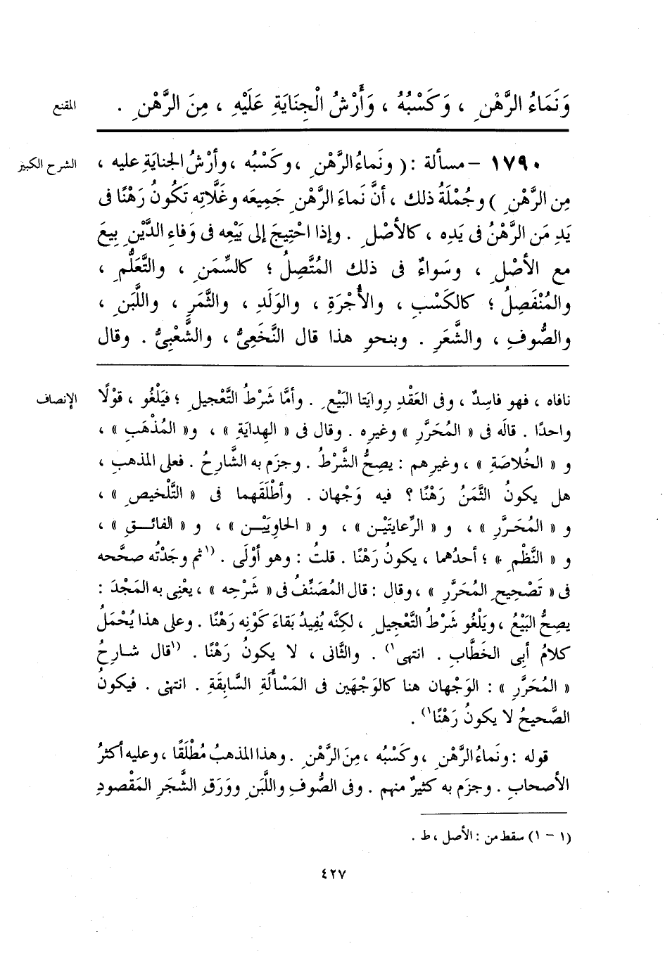 قوله: ونَماءُ الرَّهْنِ، وكَسْبُه، مِنَ الرَّهْنِ. وهذا المذهبُ مُطْلَقًا، وعليه أكثر الأصحابِ. وجزَم به كثير منهم. وفي الصُّوفِ واللَّبَنِ ووَرَقِ الشَّجَرِ المَقْصودِ