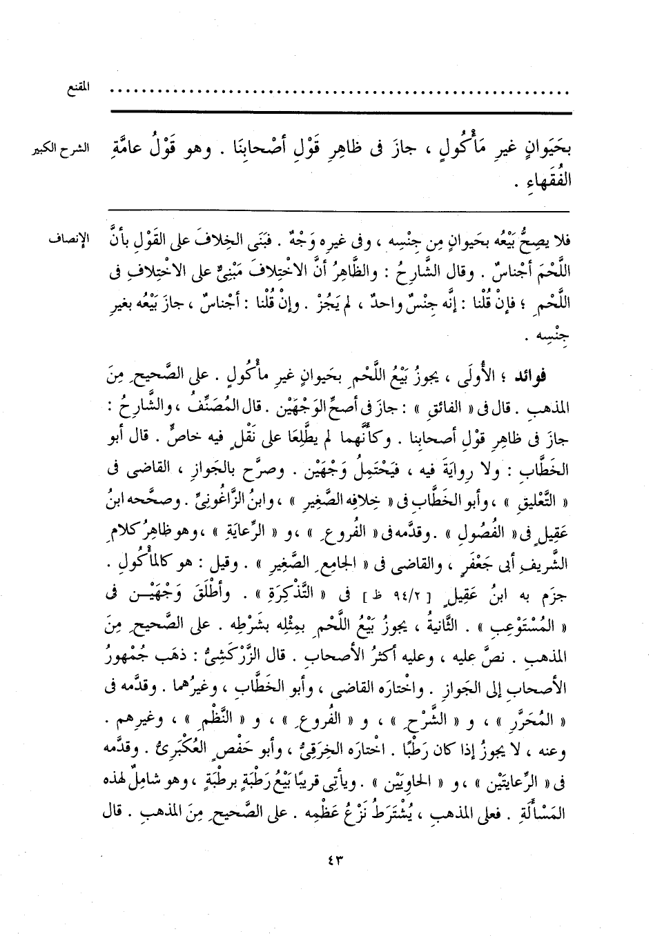 فوائد؛ الأولَى، يجوزُ بَيعُ اللَّحْمِ بحَيوانٍ غيرِ مأُكُولٍ. على الصَّحيحِ مِنَ المذهبِ. قال في «الفائقِ»: جازَ في أصحِّ الوَجْهَين. قال المُصنِّفُ، والشَّارِحُ: جازَ في ظاهِرِ قوْلِ أصحابِنا. وكأَنَّهما لم يطَّلِعَا على نَقْل فيه خاصٍّ. قال أبو الخَطَّابِ: ولا رِوايَةَ فيه، فيَحْتَمِلُ وَجْهَين. وصرَّح بالجَوازِ، القاضي في «التَّعْليقِ»، وأبو الخَطَّابِ في «خِلافِه الصَّغِيرِ»، وابنُ الزَّاغُونِيِّ. وصحَّحه ابنُ عَقِيل في «الفُصُولِ». وقدَّمه في «الفُروعِ»، و «الرِّعايَةِ»، وهو ظاهِرُ كلامِ الشَّريفِ أبي جَعْفَرٍ، والقاضي في «الجامِعِ الصَّغِيرِ». وقيل: هو كالمأْكُولِ. جزَم به ابنُ عَقِيل في «التَّذْكِرَةِ». وأطْلَقَ وَجْهَين في «المُسْتَوْعِبِ». الثَّانيةُ، يجوزُ بَيعُ اللَّحْمِ بمِثْلِه بشَرْطِه. على الصَّحيحِ مِنَ المذهبِ. نصَّ عليه، وعليه أكثرُ الأصحابِ. قال الزَّرْكَشِيُّ: ذهَب جُمْهورُ الأصحابِ إلى الجَوازِ. واخْتارَه القاضي، وأبو الخَطَّابِ، وغيرُهما. وقدَّمه في «المُحَرَّرِ»، و «الشَّرْحِ»، و «الفُروعِ»، و «النَّظْمِ»، وغيرِهم. وعنه، لا يجوزُ إذا كان رَطْبًا. اخْتارَه الخِرَقِيُّ، وأبو حَفْص العُكْبَرِيُّ. وقدَّمه في «الرِّعايتَين»، و «الحاويَين». ويأتِي قريبًا بَيعُ رَطْبَةٍ برطْبَةٍ، وهو شامِلٌ لهذه المَسْأَلةِ. فعلى المذهبِ، يُشْتَرَطُ نَزْعُ عَظْمِه. على الصَّحيحِ مِنَ المذهبِ. قال