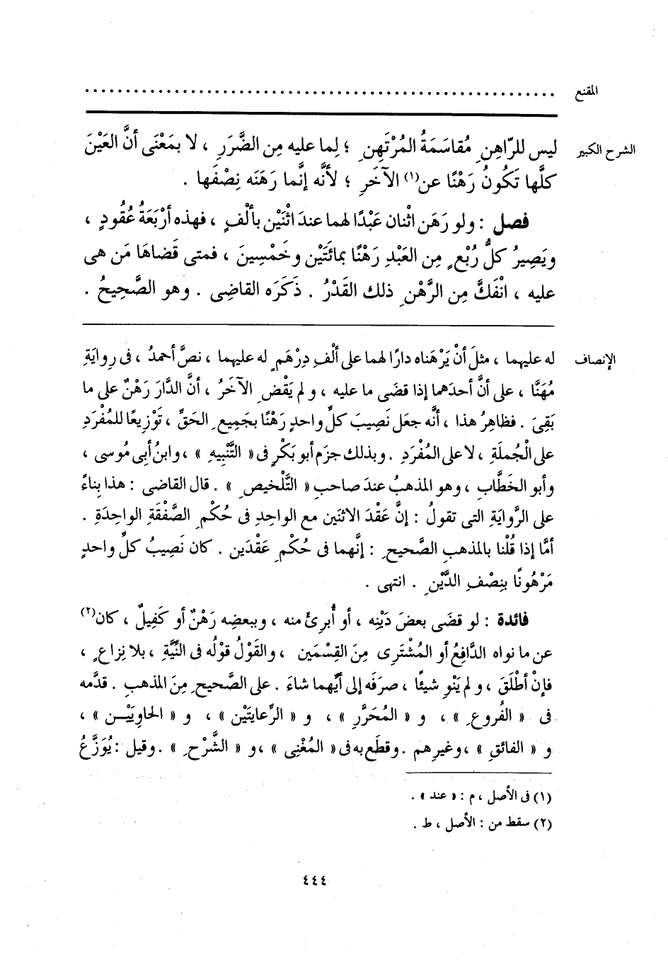 له عليهما، مثلَ أن يَرْهَناه دارًا لهما على ألْفِ دِرْهَم له عليهما، نصَّ أحمدُ، في رِوايَةِ مُهَنَّا، على أنَّ أحدَهما إذا قضَى ما عليه، ولم يَقْضِ الآخَرُ، أنَّ الدَّارَ رَهْنٌ على ما بَقِيَ. فظاهِرُ هذا، أنَّه جعَل نصِيبَ كلِّ واحدٍ رَهْنًا بجَمِيعِ الحَقِّ، تَوْزِيعًا للمُفْرَدِ على الْجُملَةِ، لا على المُفْرَدِ. وبذلك جزَم أبو بَكْر في «التَّنبِيهِ»، وابنُ أبِي مُوسى، وأبو الخَطَّابِ، وهو المذهبُ عندَ صاحبِ «التَّلْخيصِ». قال القاضي: هذا بِناءً على الرَّوايَةِ التي تقولُ: إنَّ عَقْدَ الاثنَين مع الواحِدِ في حُكْمِ الصَّفْقَةِ الواحِدَةِ. أمَّا إذا قُلْنا بالمذهبِ الصَّحيحِ: إنَّهما في حُكْمِ عَقْدَين. كان نَصِيبُ كل واحدٍ مَرْهُونًا بنِصْفِ الدَّينِ. انتهى.