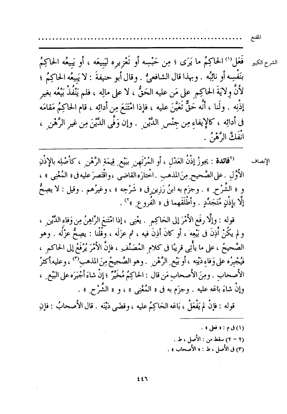 قوله: وإلَّا رفَع الأمْرَ إلى الحَاكِمِ. يعْنِي، إذا امْتَنعَ الرَّاهنُ مِن وَفاءِ الدَّينِ، ولم يكُنْ أذِنَ في بَيعِه، أو كانَ أذِنَ فيه، ثم عزَلَه، وقُلْنا: يصِحُّ عزْلُه. وهو الصحيحُ، على ما يأتي قرِيبًا في كلام المُصَنِّفِ. فإن الأمْرَ يُرْفعُ إلى الحاكمِ، فيُجْبِرُه على وَفاءِ دَينه، أو بَيعِ الرَّهْنِ. وهو الصَّحيحُ، مِنَ المذهبِ (¬2)، وعليه. أكثرُ الأصحابِ. ومِنَ الأصحابِ مَن قال: الحاكِمُ مُخَيَّرٌ؛ إنْ شاءَ أجْبَرَه على البَيعِ، وإنْ شاءَ باعَه عليه. وجزَم به في «المُغْنِي»، و «الشَّرْحِ».