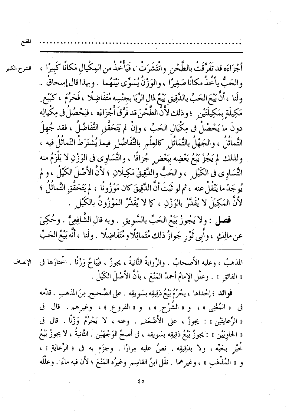 فوائد؛ إحْداها، يحْرُمُ بَيعُ دَقِيقِه بسَويقِه. على الصَّحيحِ مِنَ المذهبِ. قدَّمه في «المُغْنِي»، و «الشَّرْحِ»، و «الفروعِ»، وغيرِهم. قال في «الرعايتَين»: يجوزُ، على الأضْعَفِ. وعنه، لا يَحْرُمُ وَزْنًا. قال في «الحاويَين»: يجوزُ بَيعُ دَقِيقِه بسَويقِه، في أصحِّ الوَجْهَين. الثَّانيةُ، لا يجوزُ بَيعُ خُبْزٍ بحَمه، ولا بدَقِيقِه. نصَّ عليه مِرارًا. وجزَم به في «الرِّعايَةِ»، و «المُذْهَبِ»، وغيرِهما. نقَل ابنُ القاسِمِ وغيرُه المَنْعَ؛ لأن فيه ماءً. وعلَّلَه