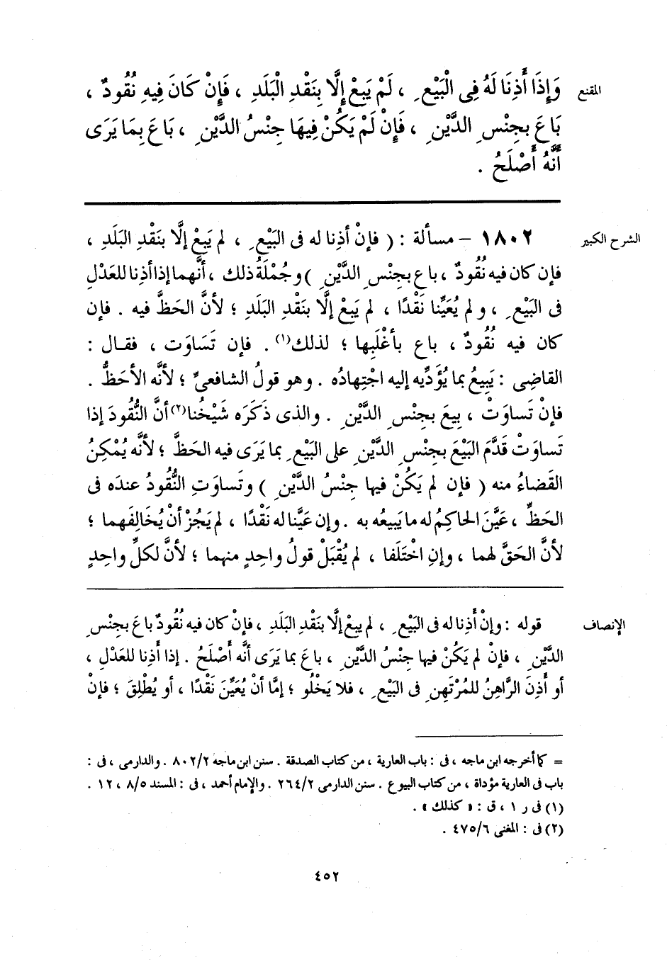 وإذا أذِنَا لَهُ فِي الْبَيعِ، لَمْ يَبعْ إلَّا بنَقْدِ الْبَلَدِ، فَإِنْ كَانَ فِيهِ نُقُودٌ، بَاعَ بجِنْسِ الدَّينِ، فَإِنْ لَمْ يَكُنْ فِيهَا جنْسُ الدَّينِ، بَاعَ بِمَا يَرَى أَنَّهُ أَصْلحُ.