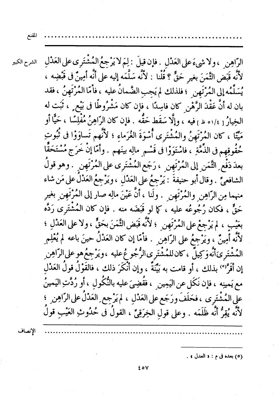 الرَّاهِنِ، ولا شيءَ على العَدْلِ. فإن قيلَ: لِمَ لا يَرْجِعُ المُشْتَرِي على العَدْلِ لأنَّه قَبَض الثَّمَنَ بغيرِ حَقٍّ؟ قُلْنا؛ لأنَّه سَلَّمَه إليه على أنَّه أمِينٌ في قَبْضِه، يُسَلِّمُه إلى المُرْتَّهِنِ، فلذلك لم يَجِبِ الضَّمانُ عليه، فأمَّا المُرْتَهِنُ، فقد بأن له أنَّ عَقْدَ الرَّهْنِ كان فاسِدًا، فإن كان مَشْرُوطًا في بَيع، ثَبَت له الخِيارُ فيه، وإلَّا سَقَط حَقُّه. فإن كان الرَّاهِنُ مُفْلِسًا، حَيًّا أو مَيِّتًا، كان المُرْتَهِنُ والمُشْتَرِي أسْوَةَ الغُرَماءِ؛ لأنَّهم تَساوَوْا في ثُبُوتِ حُقُوقِهِم في الذِّمَّةِ، فاسْتَوَوْا في قَسْمِ مالِه بينَهم. وأمّا إنْ خَرَج مُسْتَحَقًّا بعدَ دَفْعِ الثَّمَنِ إلى المُرْتَّهِنِ، رَجَع المُشْتَرِي على المُرْتَّهِنِ. وهو قولُ الشَّافعيِّ. وقال أبو حنيفةَ: يَرْجِعُ على العَدْلِ، ويَرْجِعُ العَدْلُ على مَن شاء منهما مِن الرَّاهِنِ والمُرْتَهِنِ. ولَنا، أنَّ عَينَ مالِه صار إلى المُرْتَّهِنِ بغيرِ حَقٍّ، فكان رُجُوعُه عليه، كما لو قَبَضَه منه. فإن كان المُشْتَرِي رَدَّه بعَيبٍ، لم يَرْجِعْ على المُرْتَّهِنِ؛ لأنَّه قَبَض الثَّمَنَ بحَقٍّ، ولا على العَدْلِ، لأنَّه أمِين، ويَرْجِعُ على الرَّاهِنِ. فأمَّا إن كان العَدْلُ حينَ باعه لم يُعْلِم المُشْتَرِيَ أنَّه وَكِيل، كان للمُشْتَرِي الرُّجُوعُ عليه، ويَرْجِعُ هو على الرَّاهِنِ إن أقَرَّ (¬1) بذلك، أو قامت به بَيِّنةٌ، وإن أنْكَرَ ذلك، فالقَوْلُ قولُ العَدْلِ مع يَمينِه، فإن نَكَل عن اليَمِينِ، فقُضِيَ عليه بالنُّكُولِ، أو رُدَّتِ اليَمينُ على المُشْتَرِي، فحَلَفَ ورَجَع على العَدْلِ، لم يَرْجِعِ العَدْلُ على الرَّاهِنِ؛ لأنَّه يُقِرُّ أنَّه ظَلَمَه. وعلى قولِ الخِرَقِيِّ، القولُ في حُدُوثِ العَيبِ قولُ