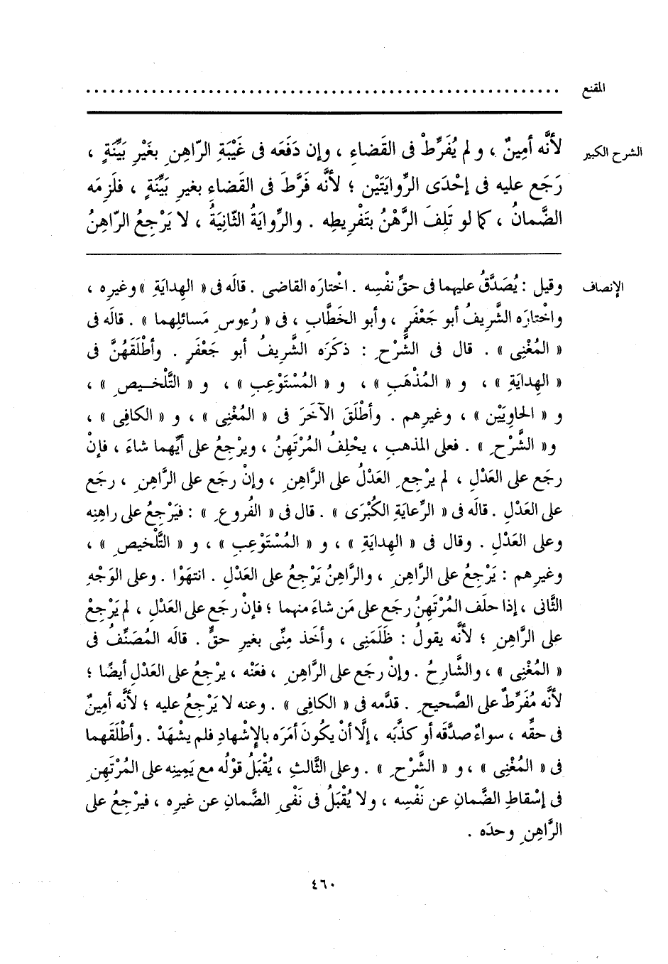 وقيل: يُصَدَّقُ عليهما في حقِّ نفْسِه. اخْتارَه القاضي. قاله في «الهِدايَةِ» وغيرِه، واختاره الشَّرِيفُ أبو جَعْفَر، وأبو الخَطَّابِ، في «رُءوسِ مَسائلِهما». قاله في «المُغْنِي». قال في الشَّرْحِ: ذكَرَه الشَّرِيفُ أبو جَعْفَر. وأطْلَقَهُنَّ في «الهِدايَةِ»، و «المُذْهَبِ»، و «المُسْتَوْعِبِ»، و «التَّلْخيصِ»، و «الحاويَيْن»، وغيرِهم. وأطْلَقَ الآخَرَ في «المُغْنِي»، و «الكافِي»، و «الشَّرْحِ». فعلى المذهبِ، يحْلِفُ المُرْتَهِنُ، ويرْجِعُ على أيِّهما شاءَ، فإنْ رجَع على العَدْلِ، لم يرْجِعِ العَدْلُ على الرَّاهِنِ، وإنْ رجَع على الرَّاهِنِ، رجَع على العَدْلِ. قاله في «الرِّعايَةِ الكُبْرَى». قال في «الفُروعِ»: فيَرْجِعُ على راهِنِه وعلى العَدْلِ. وقال في «الهِدايَةِ»، و «المُسْتَوْعِبِ»، و «التَّلخيصِ»، وغيرِهم: يَرْجِعُ على الرَّاهِنِ، والرَّاهِنُ يَرْجِعُ على العَدْلِ. انتهَوْا. وعلى الوَجْهِ الثَّاني، إذا حلَف المُرْتَهِنُ رجَع على مَن شاءَ منهما؛ فإنْ رجَع على العَدْلِ، لم يَرْجِعْ على الرَّاهِنِ؛ لأنَّه يقولُ: ظَلَمَنِي، وأخَذ مِنِّي بغيرِ حق. قاله المُصنِّفُ في «المُغْنِي»، والشَّارِحُ. وإنْ رجَع على الرَّاهِنِ، فعَنْه، يرْجِعُ على العَدْلِ أيضًا؛ لأنَّه مُفَرِّط على الصَّحيحِ. قدَّمه في «الكافِي». وعنه لا يَرْجِعُ عليه؛ لأنَّه أمِينٌ في حقِّه، سواءٌ صدَّقَه أو كذَّبَه، إلَّا أنْ يكُونَ أمَرَه بالإشْهادِ فلم يشْهَدْ. وأطْلَقَهما في «المُغْنِي»، و «الشَّرْحِ». وعلى الثَّالثِ، يُقْبَلُ قوْلُه مع يَمِينه على المُرْتَهِن في إسْقاطِ الضَّمانِ عن نَفْسِه، ولا يُقْبَلُ في نَفْي الضَّمانِ عن غيرِه، فيرْجِعُ على الرَّاهِنَ وحدَه.