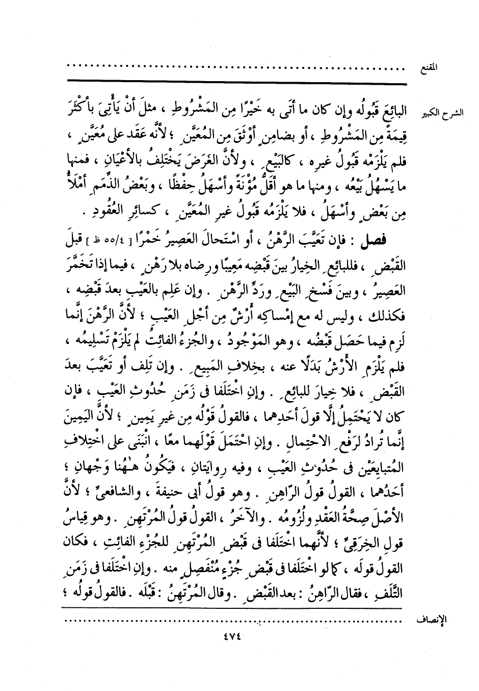 فصل: فإن تَعَيَّبَ الرَّهْنُ، أو اسْتَحال العَصِيرُ خَمْرًا قبلَ القَبْضِ، فللبائِعِ الخِيارُ بينَ قَبْضِه مَعِيبًا ورِضاه بلارَهْن، فيما إذا تَخَمَّرَ العَصِيرُ، وبينَ فَسْخِ البَيعِ ورَدِّ الرَّهْنِ. وإن عَلِم بالعَيب بعدَ قَبْضِه، فكذلك، وليس له مع إمْساكِه أرْشٌ مِن أجْلِ العَيبِ؛ لأَنَّ الرَّهْنَ إنَّما لَزِم فيما حَصَل قَبْضُه، وهو المَوْجُودُ، والجُزءُ الفائِتُ لم يَلْزَمْ تَسْلِيمُه، فلم يَلْزَمِ الأرْشُ بَدَلًا عنه، بخِلافِ المَبِيعِ. وإن تَلِف أو تَعَيَّبَ بعدَ القَبْض، فلا خِيارَ للبائِعِ. وإنِ اخْتَلَفا في زَمَنِ حُدُوثِ العَيب، فإن كان لا يَحْتَمِلُ إلَّا قولَ أحَدِهما، فالقولُ قَوْلُه مِن غيرِ يَمِين؛ لأنَّ اليَمِينَ إنَّما تُرادُ لرَفْعِ الاحْتِمالِ. وإنِ احْتَمَلَ قَوْلَهما معًا، انْبَنَى على اخْتِلافِ المُتبايِعَين في حُدُوثِ العَيبِ، وفيه رِوايَتانِ، فيَكُونُ ههُنا وَجْهانِ؛ أحَدُهما، القولُ قولُ الرّاهِنِ. وهو قولُ أبي حنيفةَ، والشافعيِّ؛ لأنَّ الأصْلَ صِحَّةُ العَقْدِ ولُزُومُه. والآخَرُ، القولُ قولُ المُرْتَهِنِ. وهو قِياسُ قولِ الخِرَقِيِّ؛ لأنَّهما اخْتَلَفا في قَبْضِ المُرْتَهِنِ للجُزْءِ الفائِتِ، فكان القولُ قولَه، كما لو اخْتَلَفا في قَبْضِ جُزْءٍ مُنْفَصِلٍ منه. وإنِ اخْتَلَفا في زَمَنِ التَّلَفِ، فقال الرّاهِنُ: بعد القَبْضِ. وقال المُرْتَهِنُ: قَبْلَه. فالقولُ قولُه؛