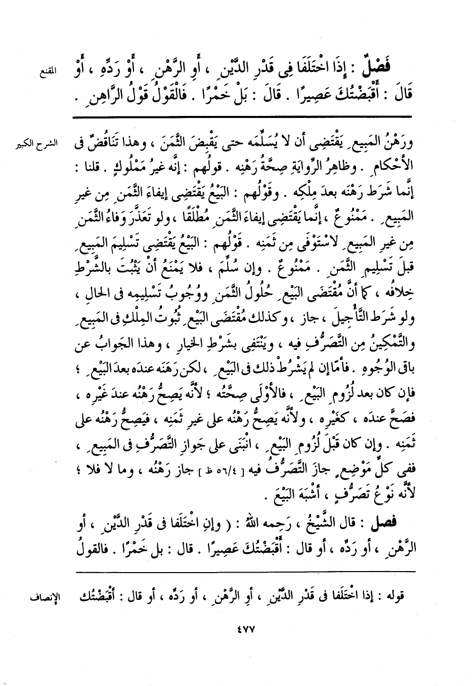 فَصْلٌ: إِذَا اخْتَلَفَا فِي قَدْرِ الدَّينِ، أو الرَّهْنِ، أوْ رَدِّهِ، أوْ قَال: أَقْبَضْتُكَ عَصِيرًا. قَال: بَلْ خَمْرًا. فَالْقَوْلُ قَوْلُ الرَّاهِنِ.