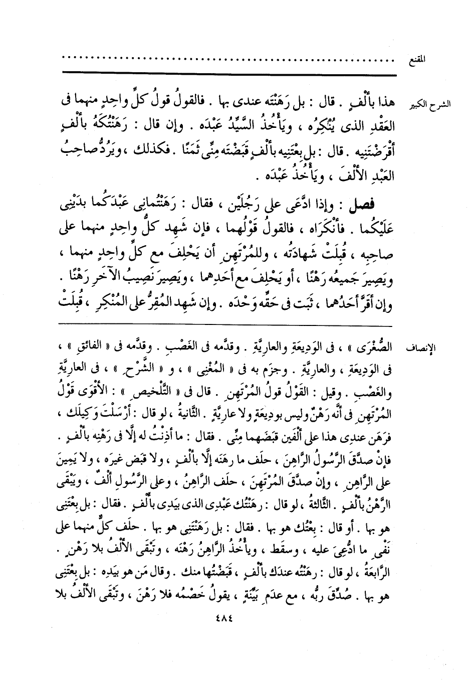 الصُّغْرَى»، في الوَدِيعَةِ والعارِيَّةِ. وقدَّمه في الغَصْبِ. وقدَّمه في «الفائقِ»، في الوَدِيعَةِ، والعارِيةِ. وجزَم به في «المُغْنِي»، و «الشَّرْحِ»، في العارِيَّةِ والغَصْبِ. وقيل: القَوْلُ قولُ المُرْتَهِنِ. قال في «التَّلْخيصِ»: الأقْوَى قَوْلُ المُرْتَهِنِ في أنَّه رَهْن وليس بودِيعَةٍ ولا عارِيَّةٍ. الثانيةُ، لو قال: أرْسَلْتَ وَكِيلَك، فرَهَن عندِي هذا على ألْفَين قبَضَهما مِنِّي. فقال: ما أذِنْتُ له إلَّا في رَهْنِه بألفٍ. فإنْ صدَّقَ الرسُولُ الراهِنَ، حلَف ما رهَنَه إلا بألْفٍ، ولا قبَض غيرَه، ولا يَمِينَ على الراهِنِ، وإنْ صدَّقَ المُرْتَهِنَ، حلَف الرَّاهِنُ، وعلى الرَّسُولِ ألْفٌ، ويَبْقَى الرهْنُ بألف. الثَّالثةُ، لو قال: رهَنْتُك عَبْدِي الذي بيَدِي بألفٍ. فقال: بل بِعْتَنِي هو بها. أو قال: بِعْتُك هو بها. فقال: بل رَهَنْتَنِي هو بها. حلَف كل منهما على نَفْي ما ادُّعِيَ عليه، وسقَط، ويأخُذُ الراهِنُ رَهْنَه، وتَبْقَى الألْفُ بلا رهن. الرَّابعَةُ، لو قال: رهَنْتُه عندَك بألفٍ، قَبَضْتُها منك. وقال مَن هو بيَدِه: بل بِعْتَنِي هو بها. صُدِّقَ ربُّه، مع عدَمِ بَيِّنةٍ، يقولُ خَصْمُه فلا رَهْنَ، وتَبْقَى الألْفُ بلا