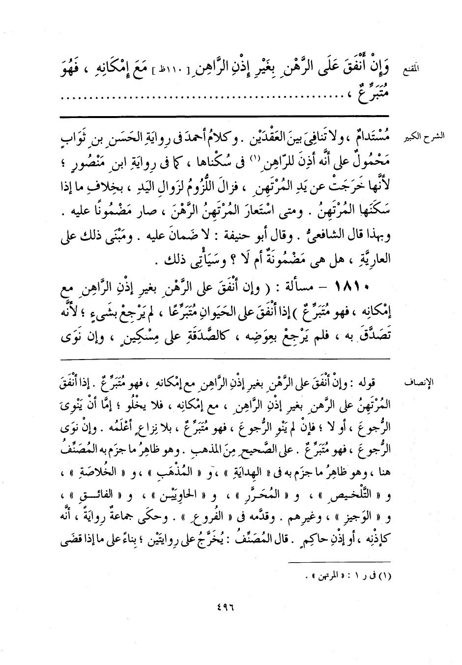 قوله: وإنْ أنْفَقَ على الرَّهْنِ بغيرِ إذْنِ الرَّاهِنِ مع إمْكانهِ، فهو مُتَبَرِّعٌ. إذا أنْفَقَ المُرْتَهِنُ على الرَّهنِ بغيرِ إذْنِ الرَّاهِنِ، مع إمْكانِه، فلا يخْلُو؛ إمَّا أنْ يَنْويَ الرُّجوعَ، أو لا؛ فإنْ لم يَنْو الرُّجوعَ، فهو مُتَبَرِّعٌ، بلا نِزاعٍ أعْلَمُه. وإنْ نَوى الرُّجوعَ، فهو مُتَبَرِّعٌ. على الصَّحيحِ مِنَ المذهبِ. وهو ظاهِرُ ما جزَم به المُصَنِّفُ هنا، وهو ظاهِرُ ما جزَم به في «الهِدايَةِ»، و «المُذْهَبِ»، و «الخُلاصَةِ»، و «التَّلْخيصِ»، و «المُحَرَّرِ»، و «الحاويَيْن»، و «الفائقِ»، و «الوَجيزِ»، وغيرِهم. وقدَّمه في «الفُروعِ». وحكَى جماعةٌ رِوايَةً، أنَّه كإذْنِه، أو إذْنِ حاكِم. قال المُصَنِّفُ: يُخَرَّجُ على رِوايتَين؛ بِناءً على ما إذا قضَى