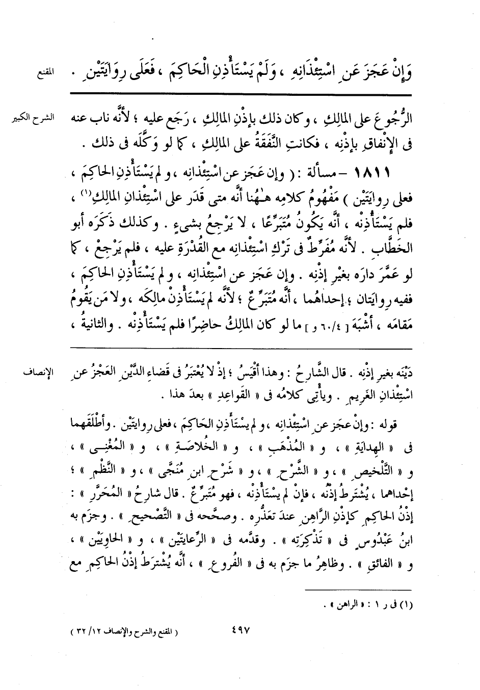 قوله: وإنْ عجَز عنِ اسْتِئْذانِه، ولم يسْتَأَذنِ الحَاكِمَ، فعلى رِوايتَين. وأطْلَقَهما في «الهِدايَةِ»، و «المُذْهَبِ»، و «الخُلاصَةِ»، و «المُغْنِي»، و «التَّلْخيصِ»، و «الشَّرْحِ»، و «شَرْحِ ابنِ مُنَجَّى»، و «النَّظْمِ»؛ إحْداهما، يُشْتَرطُ إذْنُه، فإنْ لم يسْتَأْذِنْه، فهو مُتَبرِّعٌ. قال شارِحُ «المُحَرَّرِ»: إذْنُ الحاكِمِ كإذْنِ الرَّاهِنِ عندَ تعَذُّرِه. وصحَّحه في «التَّصْحيحِ». وجزَم به ابنُ عَبْدُوس في «تَذْكِرَتِه». وقدَّمه في «الرعايتَين»، و «الحاويَيْن»، و «الفائقِ». وظاهِرُ ما جزَم به في «الفُروعِ»، أنَّه يُشْترَطُ إذْنُ الحاكِمِ مع