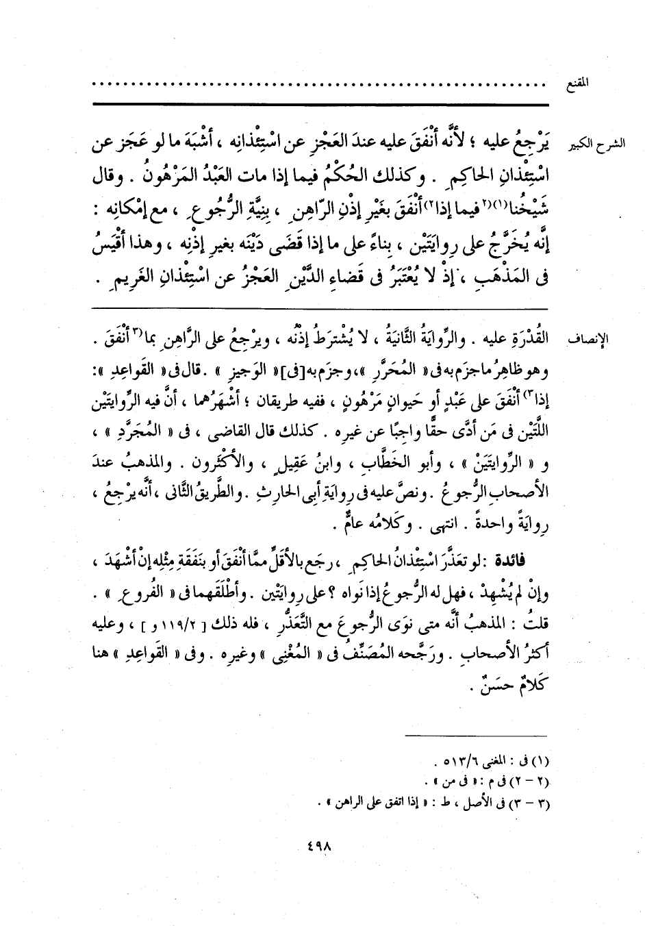 القُدْرَةِ عليه. والرِّوايَةُ الثَّانيَةُ، لا يُشْترَطُ إذْنُه، ويرْجِعُ على الرَّاهِنِ بما [أنْفَقَ. وهو ظاهِرُ ما جزَم به في «المُحَررِ»، وجزَم به [في] «الوَجيز». قال في «القَواعِدِ»: إذا] (¬1) أنْفَقَ على عَبْدٍ أو حَيوانٍ مَرْهُونٍ، ففيه طريقان؛ أشْهَرُهما، أنَّ فيه الروايتَين اللَّتَيْن في مَن أدَّى حقًّا واجِبًا عن غيرِه. كذلك قال القاضي، في «المُجَرَّدِ»، و «الرِّوايتَيَنْ»، وأبو الخَطَّابِ، وابنُ عَقِيل، والأكْثَرون. والمذهبُ عندَ الأصحابِ الرُّجوعُ. ونصَّ عليه في رِوايَةِ أبِي الحارِثِ. والطَّريقُ الثَّاني، أنَّه يرْجِعُ، رِوايَةً واحدة. انتهى. وكَلامُه عامٌّ.