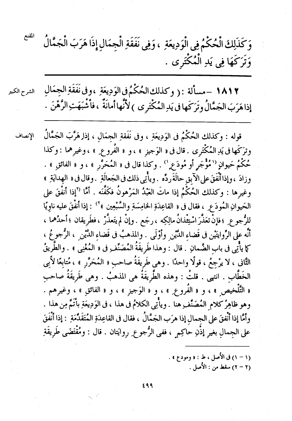 قوله: وكذلك الحُكْمُ في الوَدِيعَةِ، وفي نَفَقةِ الجِمَالِ، إذا هَرَّبَ الجَمَّالُ وترَكَها في يَدِ المُكْتَرِي. قال في «الوَجيزِ»، و «الفُروعِ»، وغيرِهما: وكذا حُكْمُ حَيوانٍ [مُؤجَر أو مُودَعٍ] (¬1). وكذا قال في «المُحَرَّرِ»، و «الفائقِ». وزادَ، وإذا أنْفَقَ على الآبِقِ حالةَ ردِّه. ويأْتِي ذلك في الجَعالةِ. وقال في «الهِدايَةِ» وغيرِها: وكذلك الحُكْمُ إذا ماتَ العَبْدُ المَرْهونُ فكَفَّنَه. أمَّا [إذا أنفْقَ على الحَيوانِ المُودَعِ، فقال في «القاعِدَةِ الخامِسَةِ والسَّبْعِين»] (¬2): إذا أنفْقَ عليه ناويًا للرُّجوعِ؛ فإنْ تعَذَّرَ اسْتِئْذانُ مالِكِه، رجَع. وإنْ لم يتَعذَّرْ، فطَرِيقان؛ أحدُهما، أنَّه على الرِّوايتَين في قَضاءِ الدَّينِ وأوْلَى. والمذهبُ في قَضاءِ الدَّينِ، الرُّجوعُ، كما يأْتِي في بابِ الضَّمانِ. قال: وهذا طَرِيقَةُ المُصَنِّفِ في «المُغْنِي». والطَّريقُ الثَّاني، لا يرْجِعُ، قولًا واحدًا. وهي طَرِيقَةُ صاحبِ «المُحَرَّرِ»، مُتابِعًا لأبِي الخَطابِ. انتهى. قلتُ: وهذه الطَّرِيقَةُ هي المذهبُ. وهي طَرِيقَةُ صاحبِ «التلْخيصِ»، و «الفُروعِ»، و «الوَجيزِ»، و «الفائقِ»، وغيرِهم. وهو ظاهِرُ كلامِ المُصَنِّفِ هنا. ويأْتِي الكلامُ في هذا، في الوَدِيعَةِ بأتَمَّ مِن هذا. وأمَّا إذا أنْفقَ على الجِمالِ إذا هرَب الجَمَّالُ، فقال في القاعِدَةِ المُتَقَدِّمَةِ: إذا أنْفَقَ على الجِمالِ بغيرِ إذْنِ حاكِمٍ، ففي الرُّجوعِ رِوايَتان. قال: ومُقْتَضَى طَرِيقَةِ