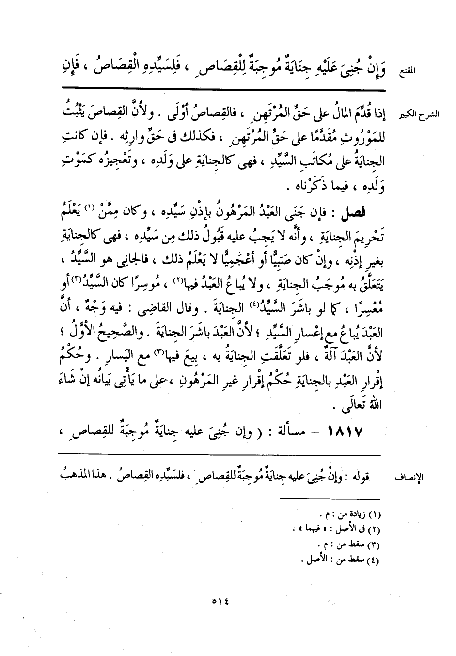 وَإنْ جُنِيَ عَلَيهِ جِنَايَةٌ مُوجِبَةٌ لِلْقِصَاص، فَلِسَيِّدِهِ الْقِصَاصُ، فَإِنِ