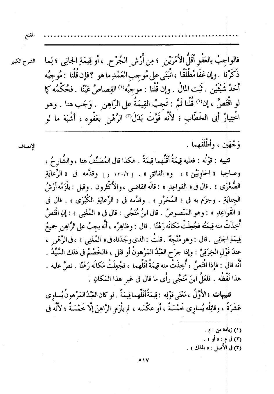 تنبيه: قوْلُه: فعليه قِيمَةُ أقَلِّهما قِيمَةً. هكذا قال المُصَنِّفُ هنا، والشَّارِحُ، وصاحِبا «الحاويَيْن»، و «الفائقِ». وقدَّمه في «الرِّعايَةِ الصُّغْرَى». قال في «القواعِدِ»: قاله القاضي، والأكْثَرون. وقيل: يلْزَمُه أرْشُ الجِنايَةِ. وجزَم به في «المُحَرَّرِ». وقدَّمه في «الرِّعايَةِ الكُبْرَى». قال في «القَواعِدِ»: وهو المَنْصوصُ. قال ابنُ مُنَجَّى: قال في «المُغْنِي»: إنِ اقْتَصَّ أُخِذَتْ منه قِيمَتُه فجُعِلَتْ مَكانَه رَهْنًا. قال: وظاهِرُه، أنَّه يجِبُ على الرَّاهِنِ جميعُ قِيمَةِ الجانِي. قال: وهو مُتَّجِهٌ. قلتُ: الذي وجَدْناه في «المُغْنِي»، في الرَّهْنِ، عندَ قَوْلِ الخِرَقِيِّ: وإذا جرَح العَبْدُ المَرْهونُ أو قتَل، فالخَصْمُ في ذلك السَّيِّدُ. أنَّه قال: فإذا اقْتَصَّ، أُخِذَتْ منه قِيمَةُ أقَلِّهما، فجُعِلَتْ مَكانَه رَهْنًا. نصَّ عليه. هذا لَفْظُه. فلعَلَّ ابنَ مُنَجَّى رأى ما قال في غيرِ هذا المَكانِ.