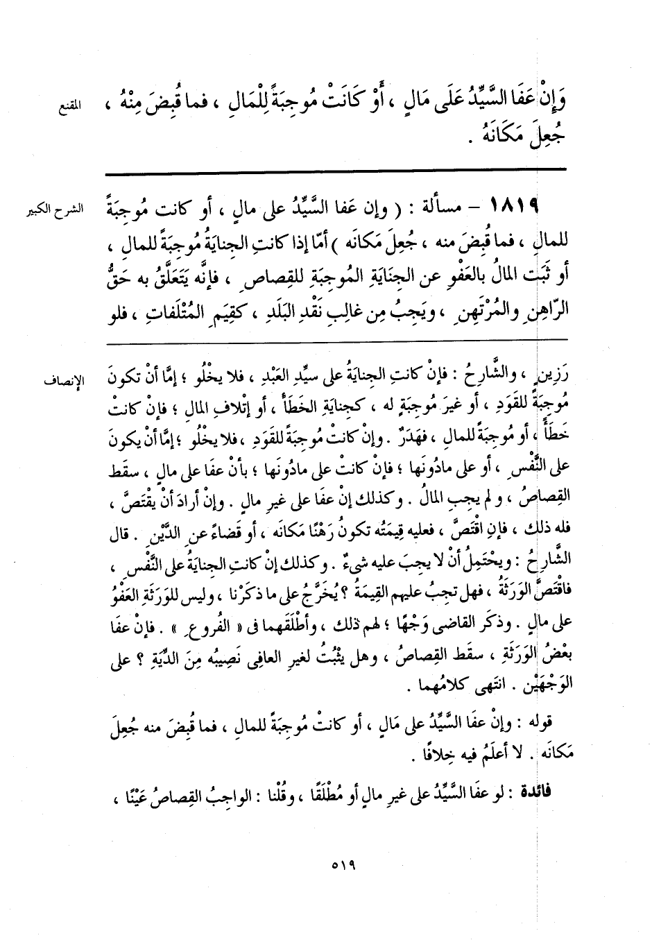 رَزِين، والشَّارِحُ: فإنْ كانتِ الجِنايَةُ على سيِّدِ العَبْدِ، فلا يخْلُو؛ إمَّا أنْ تكونَ مُوجبَة للقَوَدِ، أو غيرَ مُوجِبَةٍ له، كجِنايَةِ الخَطَأ، أو إتْلافِ المالِ؛ فإنْ كانتْ خَطَأً، أو مُوجِبَةً للمالِ، فهَدَرٌ. وإنْ كانتْ مُوجِبَةً للقَوَدِ، فلا يخْلُو؛ إمَّا أنْ يكونَ على النفْسِ، أو على ما دُونَها؛ فإنْ كانتْ على ما دُونَها؛ بأنْ عفَا على مالٍ، سقَط القِصاصُ، ولم يجِبِ المالُ. وكذلك إنْ عفَا على غيرِ مالٍ. وإنْ أرادَ أنْ يقْتَصَّ، فله ذلك، فإنِ اقْتَصَّ، فعليه قِيمَتُه تكونُ رَهْنًا مَكانَه، أو قَضاءً عنِ الدَّينِ قال الشَّارِحُ: ويحْتَمِلُ أنْ لا يجِبَ عليه شيءٌ. وكذلك إنْ كانتِ الجِنايَةُ على النَّفْسِ، فاقْتَصَّ الوَرَثَةُ، فهل تجِبُ عليهم القِيمَةُ؟ يُخرجُ على ما ذكَرْنا، وليس للوَرَثَةِ العَفْوُ على مالٍ. وذكَر القاضي وَجْهًا؛ لهم ذلك، وأطْلَقَهما في «الفُروعِ». فإنْ عفَا بعْضُ الوَرَثَةِ، سقَط القِصاصُ، وهل يثْبُتُ لغيرِ العافِي نَصِيبُه مِنَ الدِّيةِ؟ على الوَجْهَين. انتَهى كلامُهما.