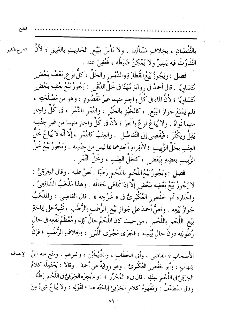 الأصحابِ؛ القاضي، وأبي الخَطَّابِ، والشَّيخَين، وغيرِهم. ومنَع منه ابنُ شِهابٍ، وأبو حَفْص العُكْبَرِيُّ. وهو رِوايَةٌ عن أحمدَ. وقالا: يَحْتَمِلُه كلامُ الخِرَقِيِّ في اللَّحْمِ بمِثْلِه. قال في «المُحَرَّرِ»: ولم يُجِزْه الخِرَقِيُّ في اللَّحْمِ رَطْبًا. وقال المُصَنِّفُ: ومَفْهومُ كلامَ الخِرَقِيِّ إباحَتُه هنا؛ لقَوْلِه: ولا يُباعُ شيء مِنَ